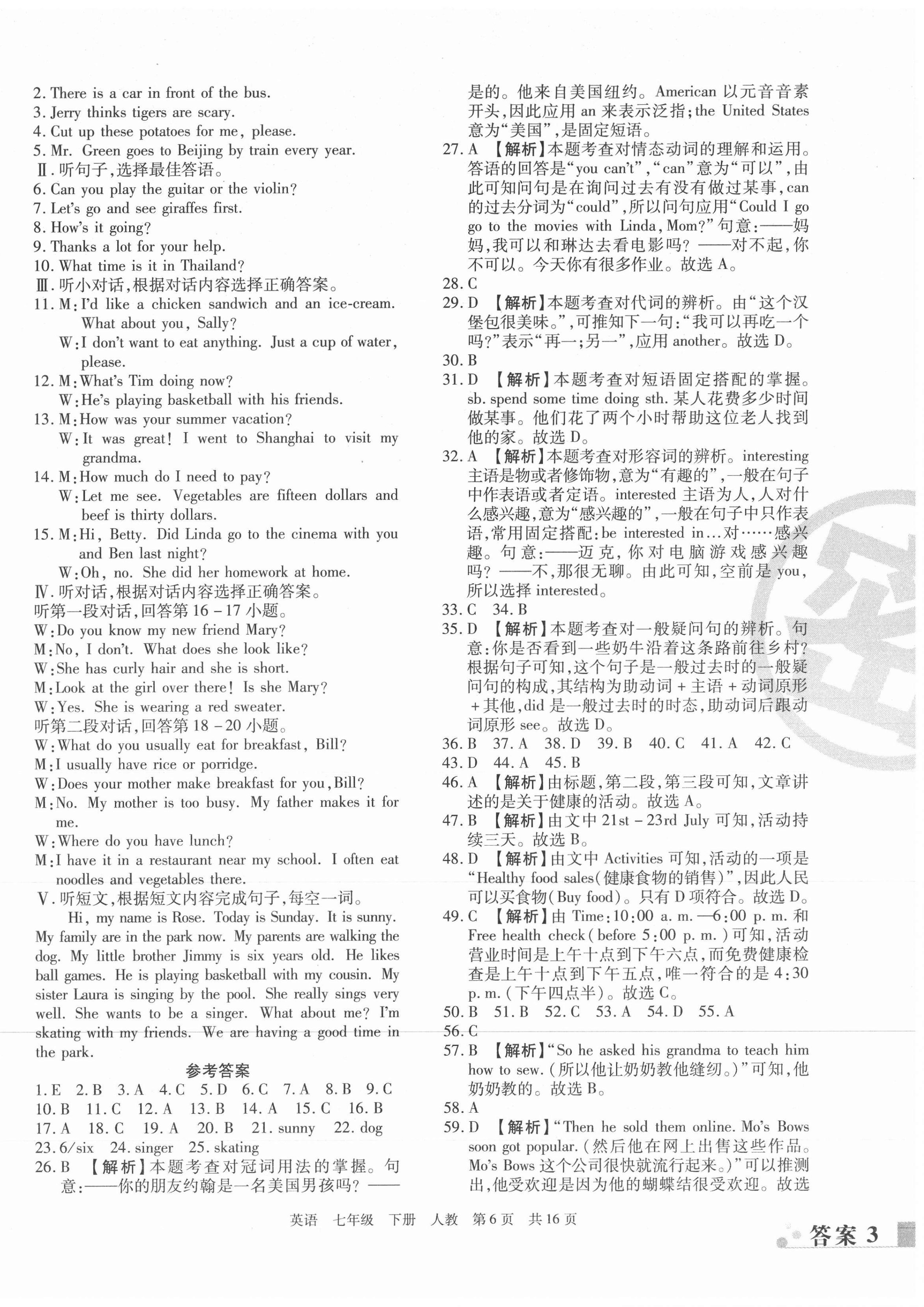 注:目前有些书本章节名称可能整理的还不是很完善,但都是按照顺序排列的,请同学们按照顺序仔细查找。练习册 2021年期末考试必刷卷七年级英语人教版黄石专版 答案主要是用来给同学们做完题方便对答案用的,请勿直接抄袭。
