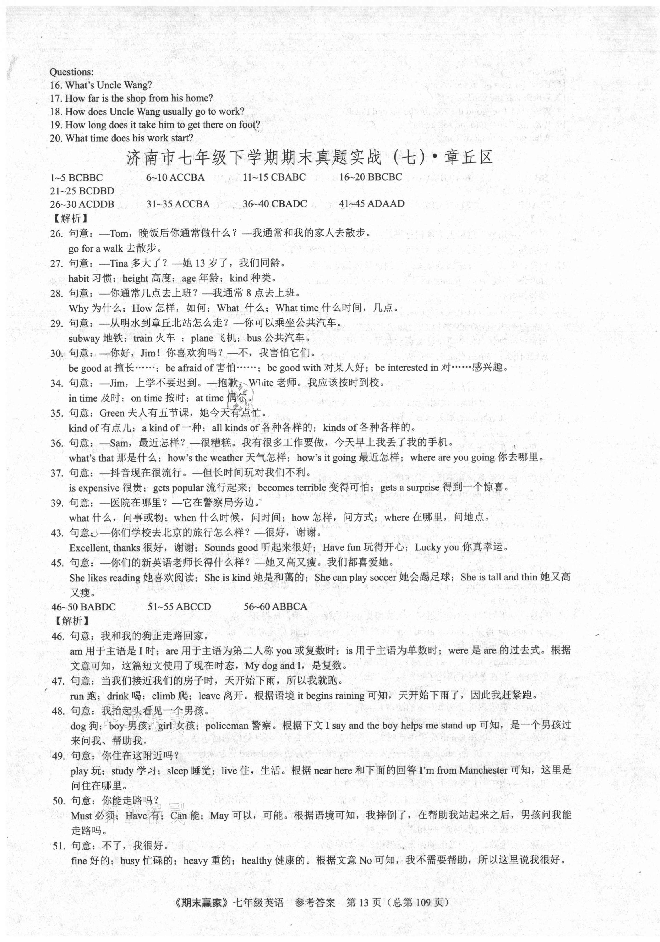注:目前有些书本章节名称可能整理的还不是很完善,但都是按照顺序排列的,请同学们按照顺序仔细查找。练习册 2021年期末赢家七年级英语下册人教版济南专用 答案主要是用来给同学们做完题方便对答案用的,请勿直接抄袭。