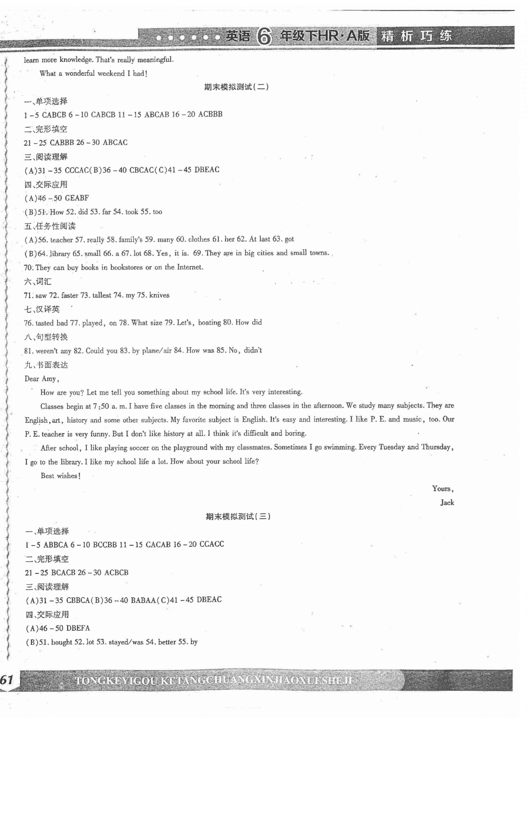 注:目前有些书本章节名称可能整理的还不是很完善,但都是按照顺序排列的,请同学们按照顺序仔细查找。练习册 2021年精析巧练阶段性同步复习与测试六年级英语下册人教版五四制A版 答案主要是用来给同学们做完题方便对答案用的,请勿直接抄袭。