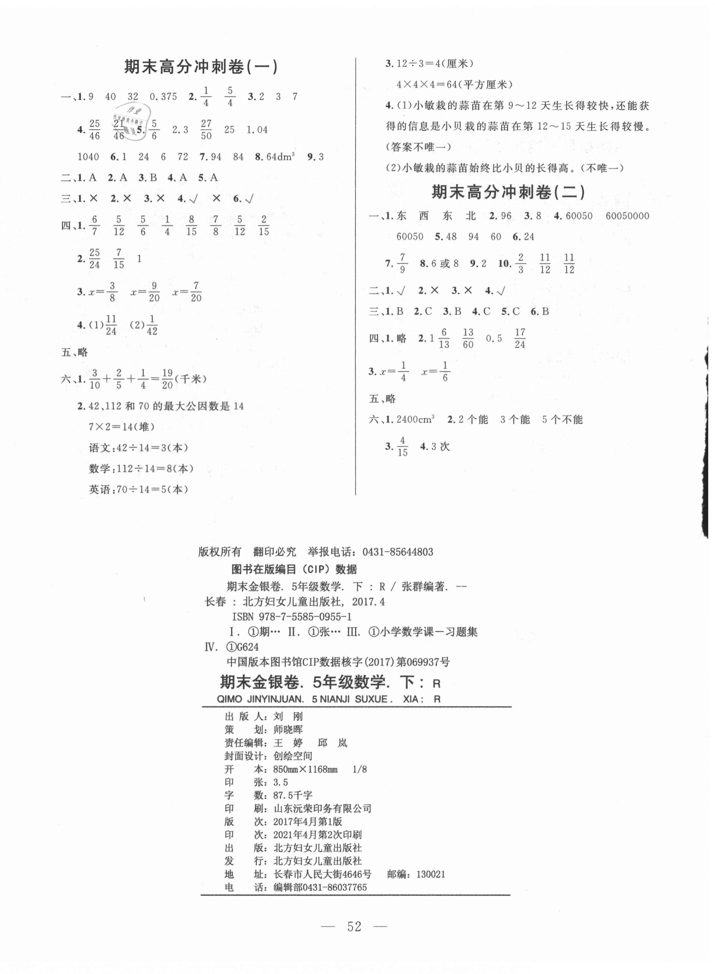注:目前有些书本章节名称可能整理的还不是很完善,但都是按照顺序排列的,请同学们按照顺序仔细查找。练习册 2021年期末金银卷五年级数学下册人教版 答案主要是用来给同学们做完题方便对答案用的,请勿直接抄袭。