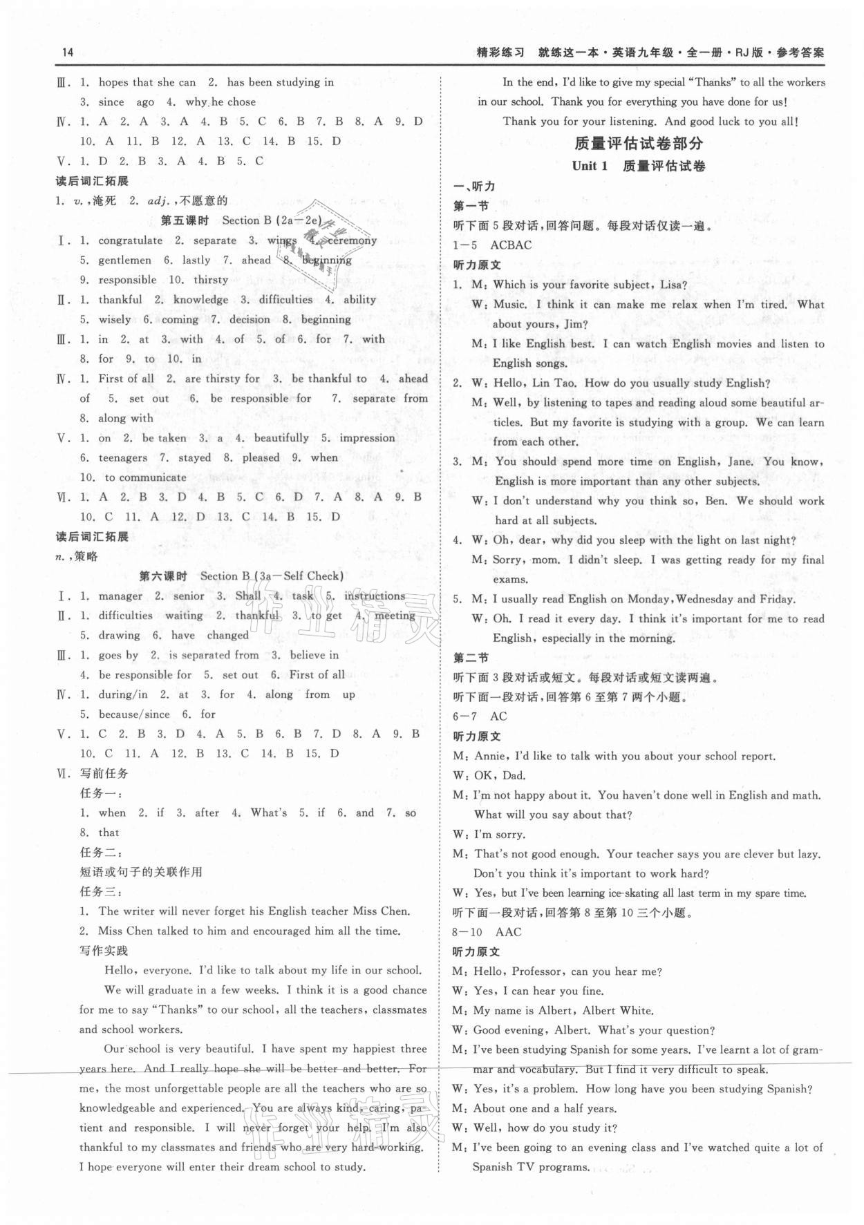 注:目前有些书本章节名称可能整理的还不是很完善,但都是按照顺序排列的,请同学们按照顺序仔细查找。练习册 2021年精彩练习就练这一本九年级英语全一册人教版 答案主要是用来给同学们做完题方便对答案用的,请勿直接抄袭。