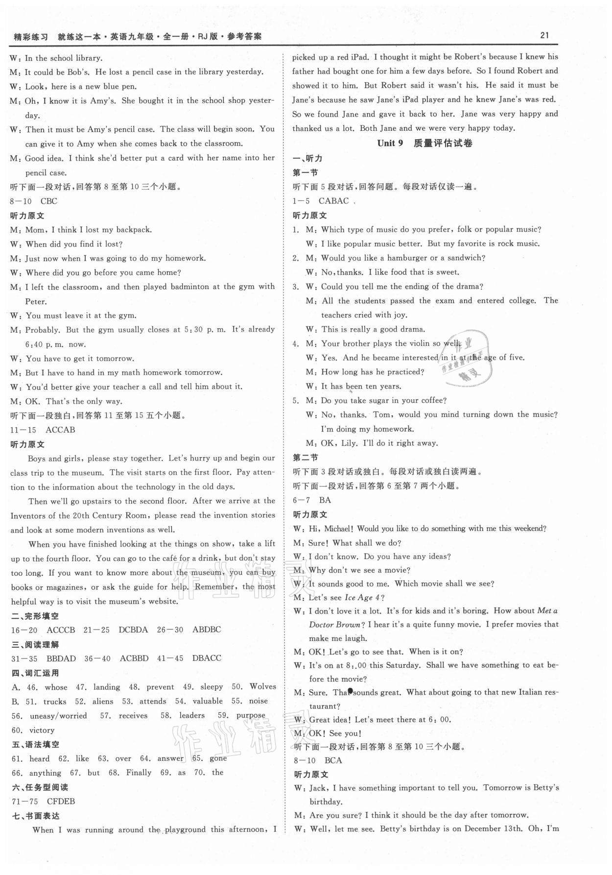 注:目前有些书本章节名称可能整理的还不是很完善,但都是按照顺序排列的,请同学们按照顺序仔细查找。练习册 2021年精彩练习就练这一本九年级英语全一册人教版 答案主要是用来给同学们做完题方便对答案用的,请勿直接抄袭。