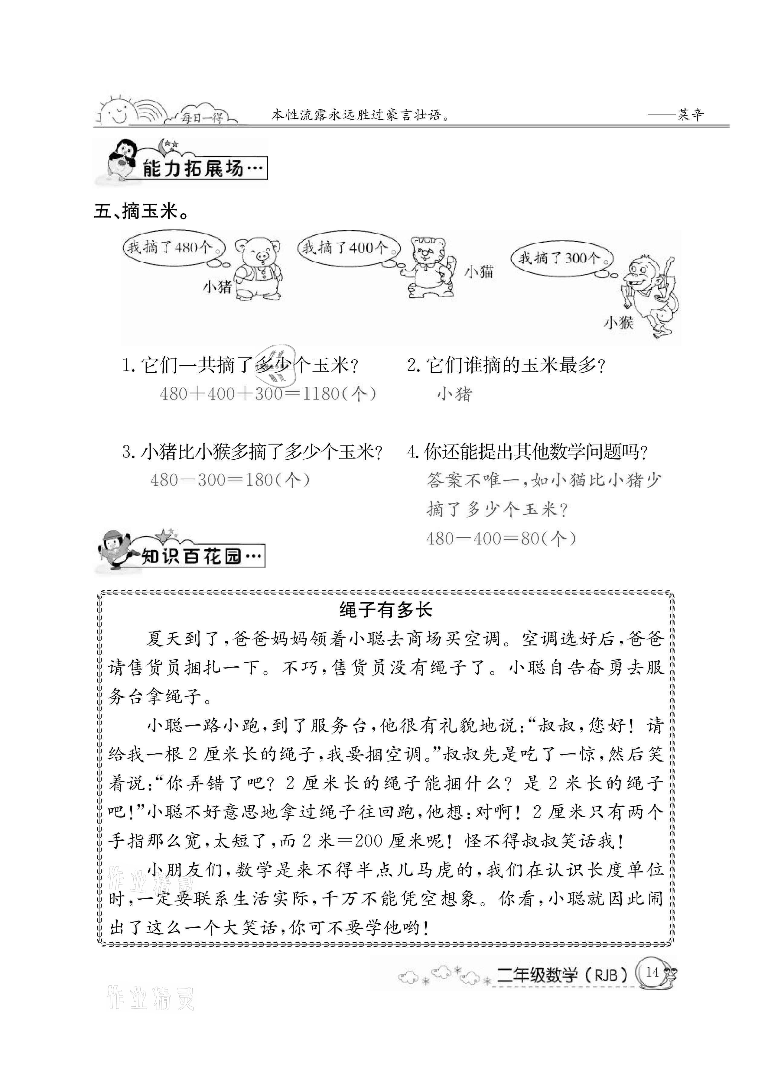 注:目前有些书本章节名称可能整理的还不是很完善,但都是按照顺序排列的,请同学们按照顺序仔细查找。练习册 2021年快乐假期暑假作业二年级数学人教版延边教育出版社 答案主要是用来给同学们做完题方便对答案用的,请勿直接抄袭。