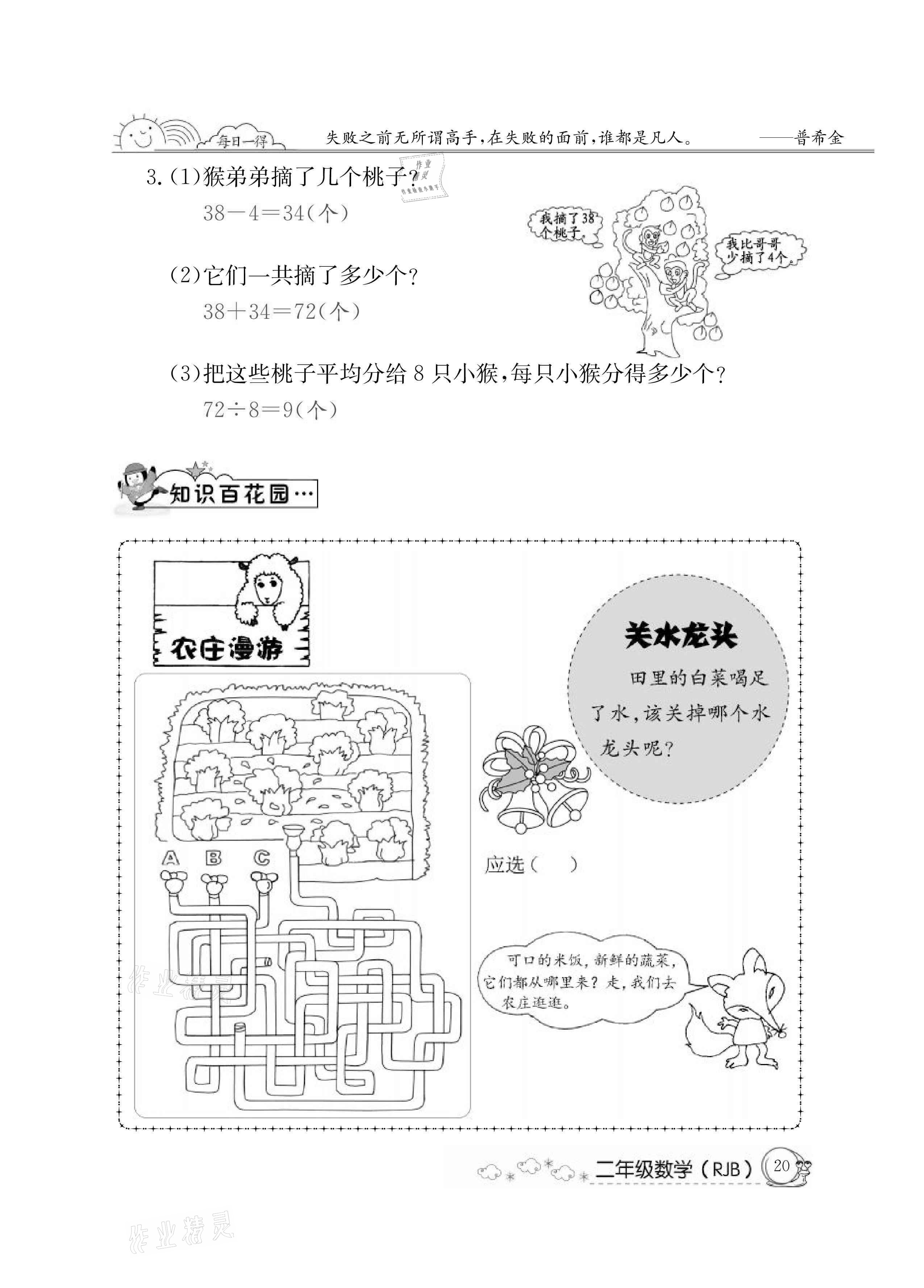 注:目前有些书本章节名称可能整理的还不是很完善,但都是按照顺序排列的,请同学们按照顺序仔细查找。练习册 2021年快乐假期暑假作业二年级数学人教版延边教育出版社 答案主要是用来给同学们做完题方便对答案用的,请勿直接抄袭。