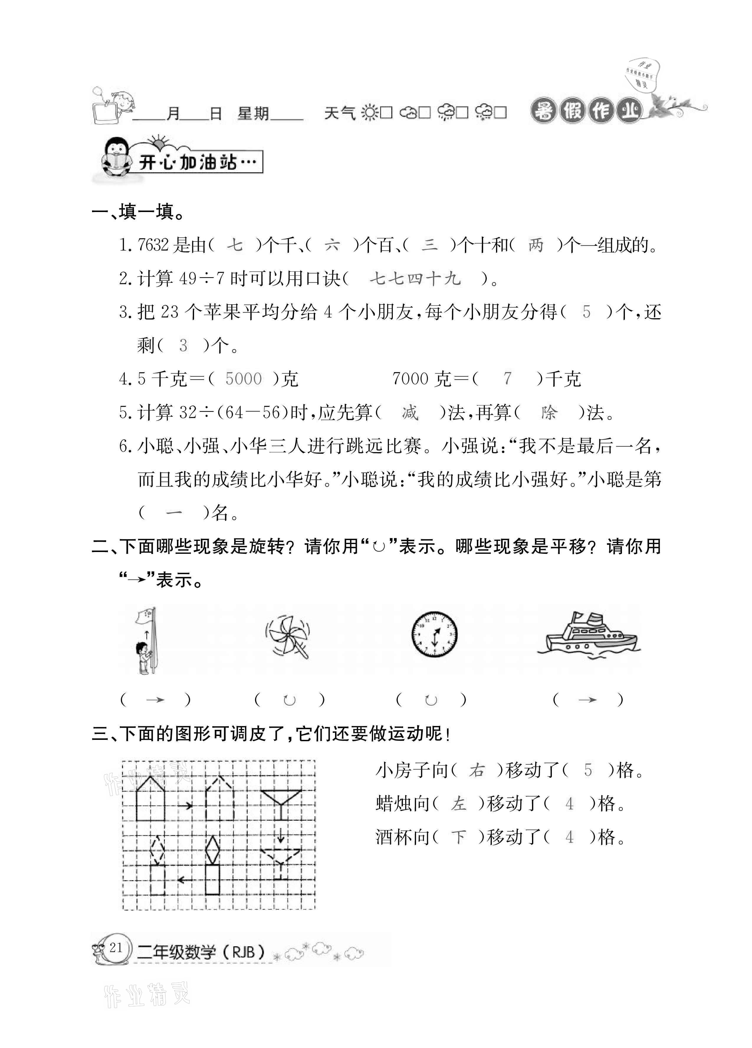 注:目前有些书本章节名称可能整理的还不是很完善,但都是按照顺序排列的,请同学们按照顺序仔细查找。练习册 2021年快乐假期暑假作业二年级数学人教版延边教育出版社 答案主要是用来给同学们做完题方便对答案用的,请勿直接抄袭。