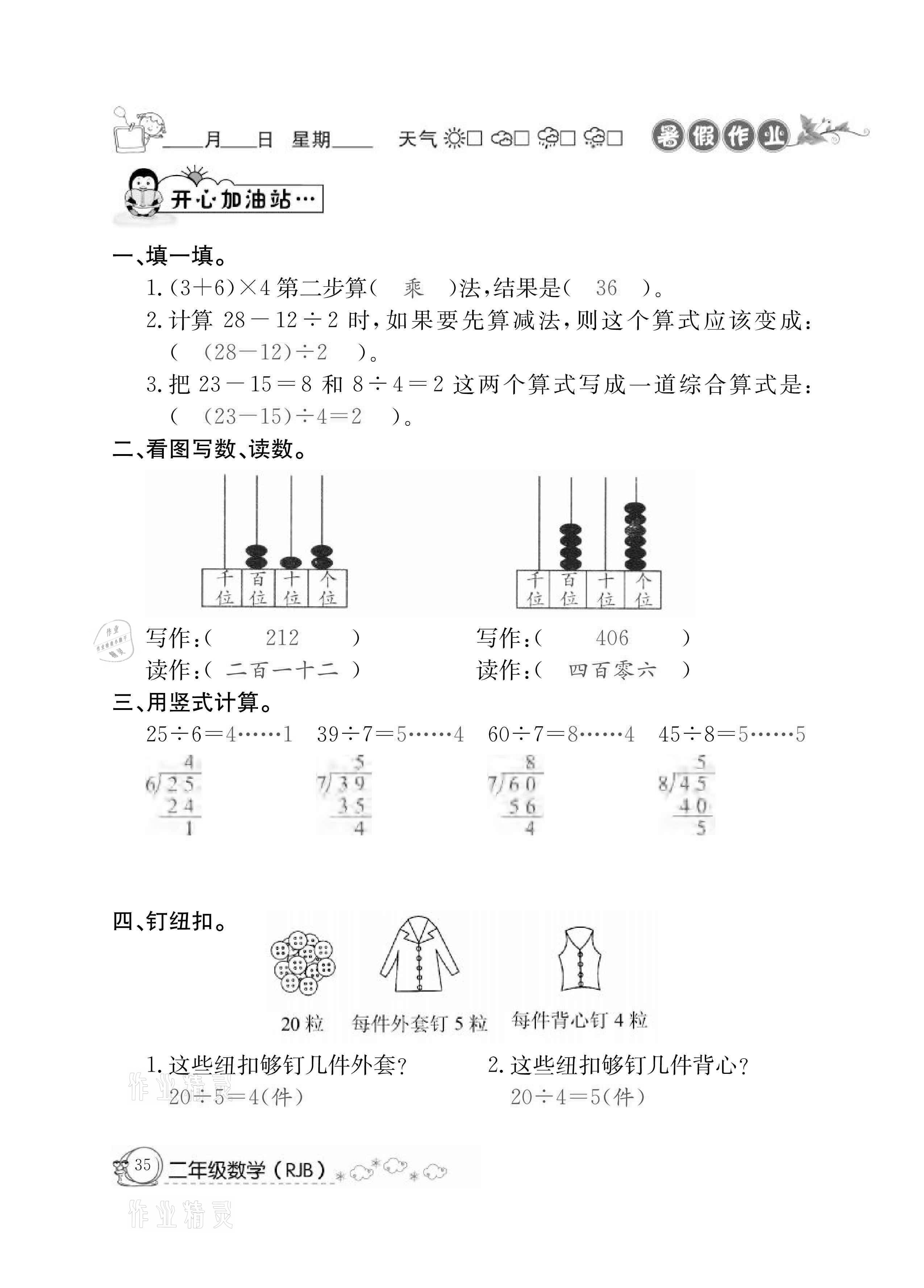 注:目前有些书本章节名称可能整理的还不是很完善,但都是按照顺序排列的,请同学们按照顺序仔细查找。练习册 2021年快乐假期暑假作业二年级数学人教版延边教育出版社 答案主要是用来给同学们做完题方便对答案用的,请勿直接抄袭。