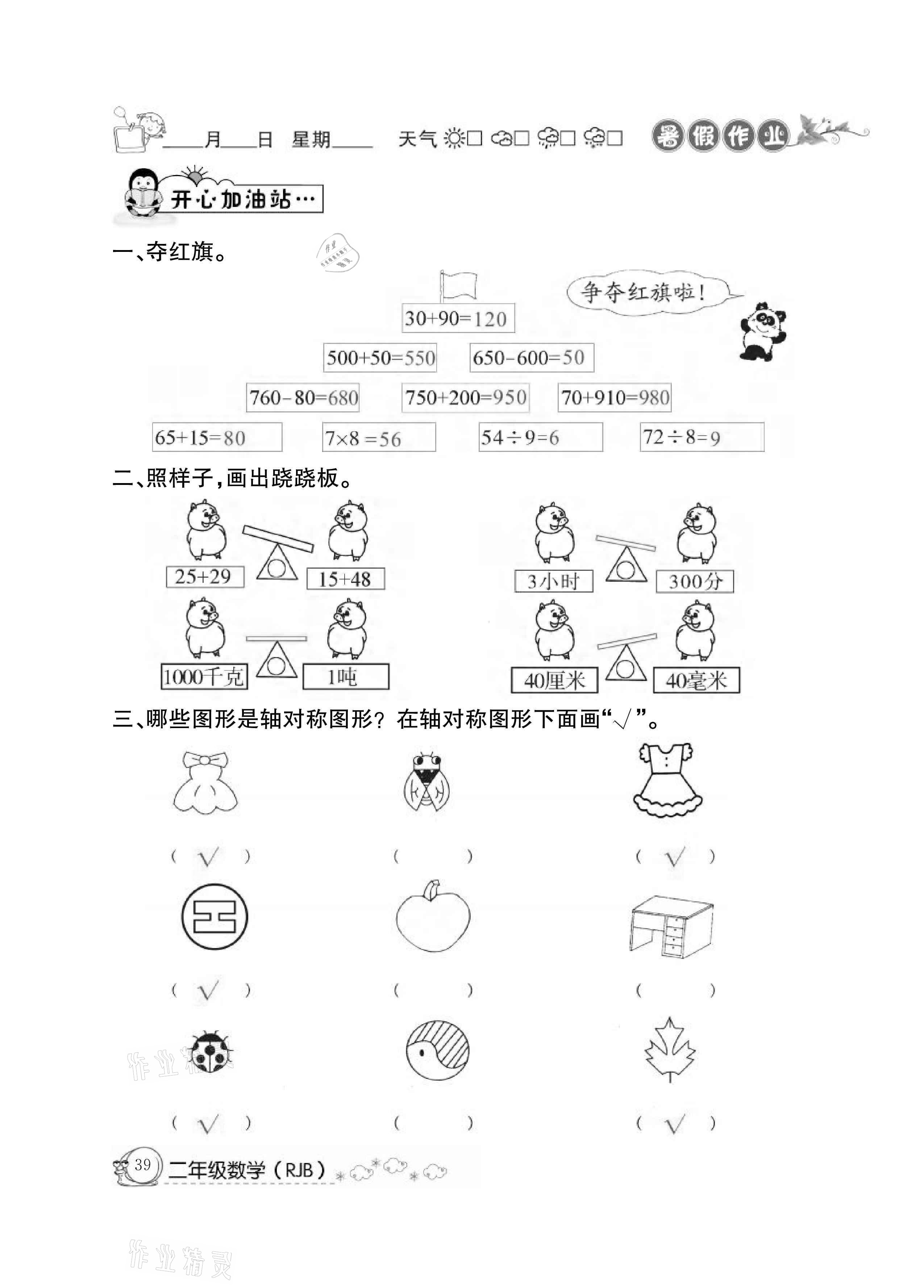 2021年快乐假期暑假作业二年级数学人教版延边教育出版社