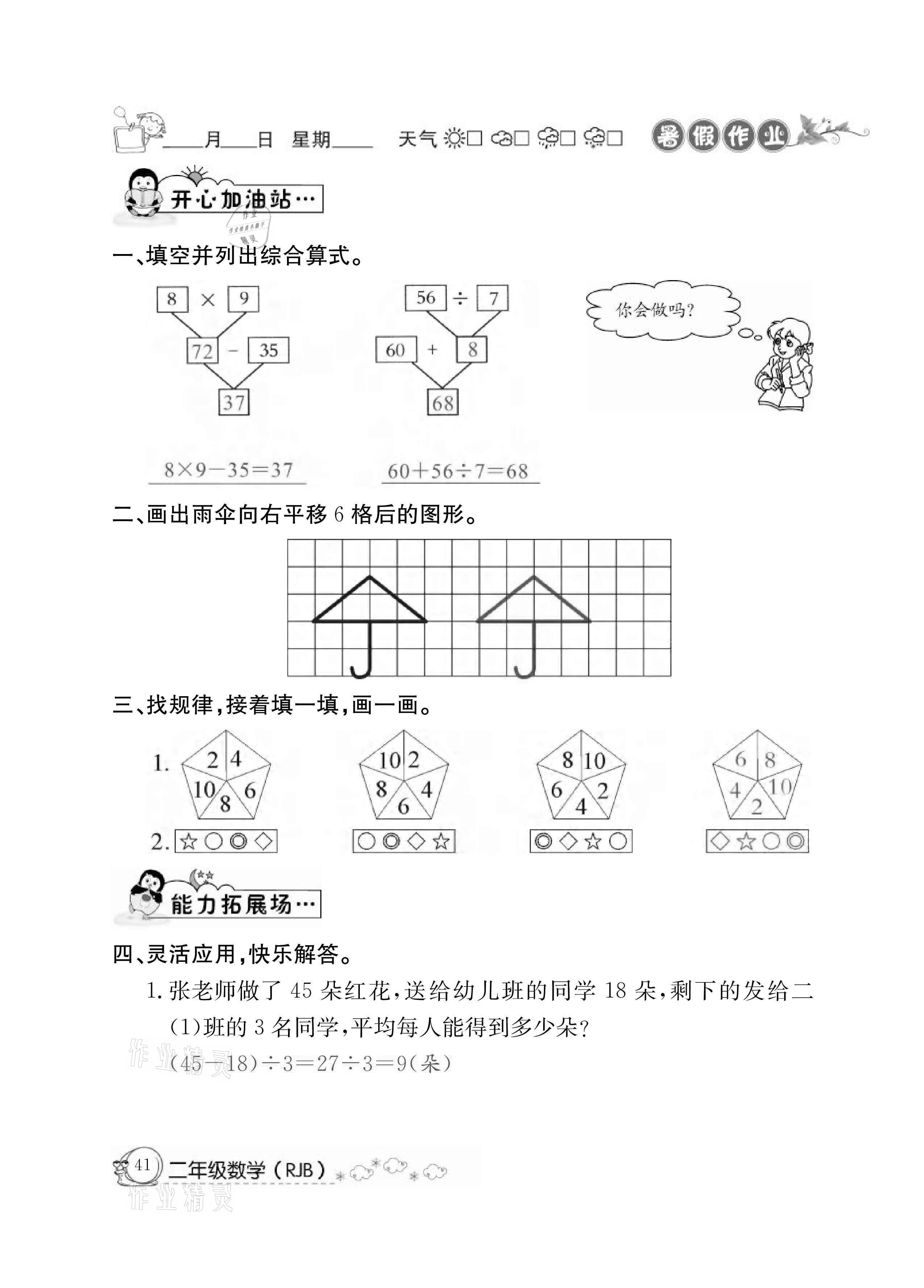 2021年快乐假期暑假作业二年级数学人教版延边教育出版社
