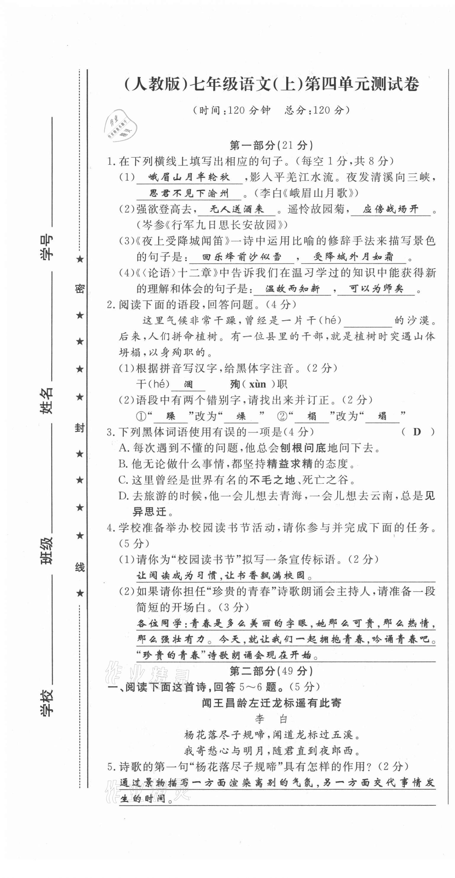 注:目前有些书本章节名称可能整理的还不是很完善,但都是按照顺序排列的,请同学们按照顺序仔细查找。练习册 2021年绩优课堂高效提升满分备考七年级语文上册人教版 答案主要是用来给同学们做完题方便对答案用的,请勿直接抄袭。