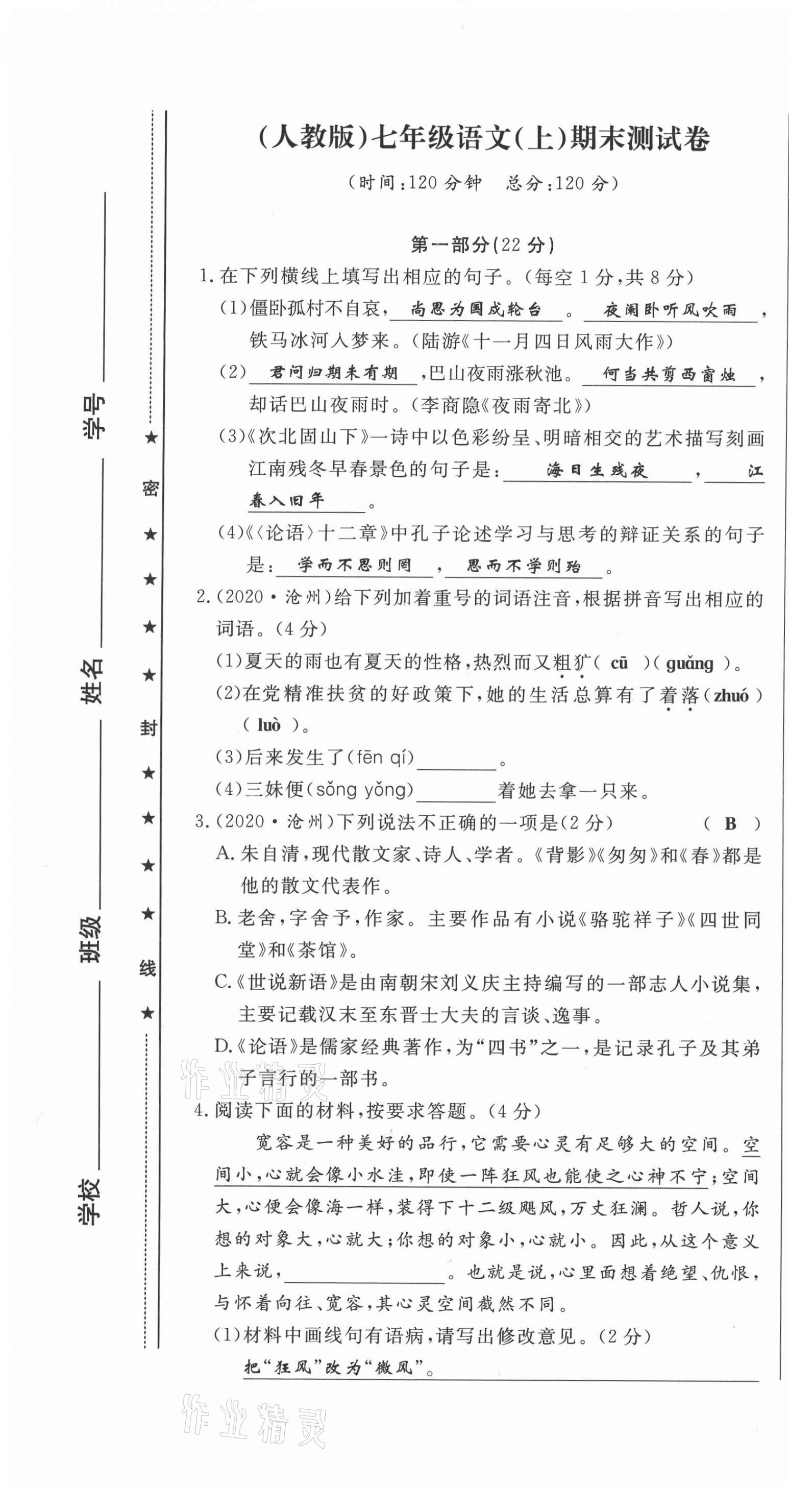 2021年绩优课堂高效提升满分备考七年级语文上册人教版