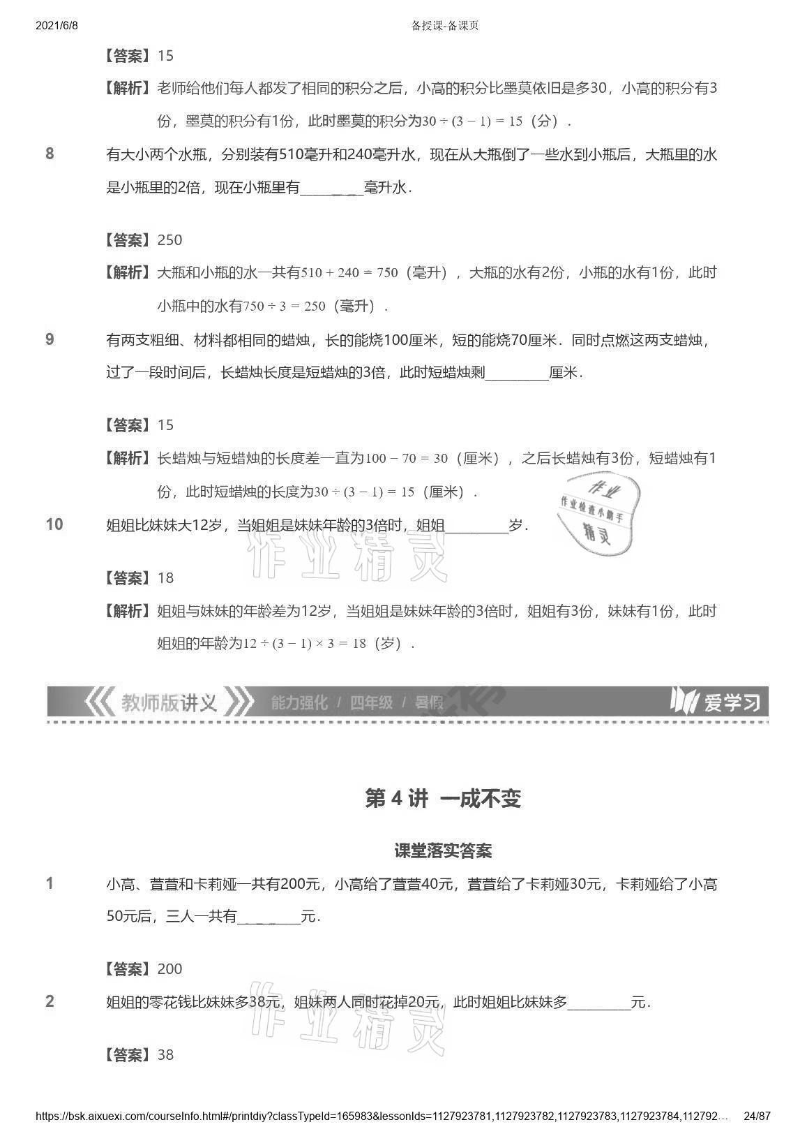 注:目前有些书本章节名称可能整理的还不是很完善,但都是按照顺序排列的,请同学们按照顺序仔细查找。练习册 2021年爱学习数学能力强化体系四年级苏教版首都师范大学出版社 答案主要是用来给同学们做完题方便对答案用的,请勿直接抄袭。