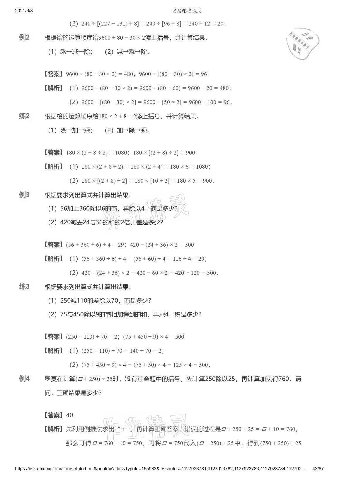 注:目前有些书本章节名称可能整理的还不是很完善,但都是按照顺序排列的,请同学们按照顺序仔细查找。练习册 2021年爱学习数学能力强化体系四年级苏教版首都师范大学出版社 答案主要是用来给同学们做完题方便对答案用的,请勿直接抄袭。