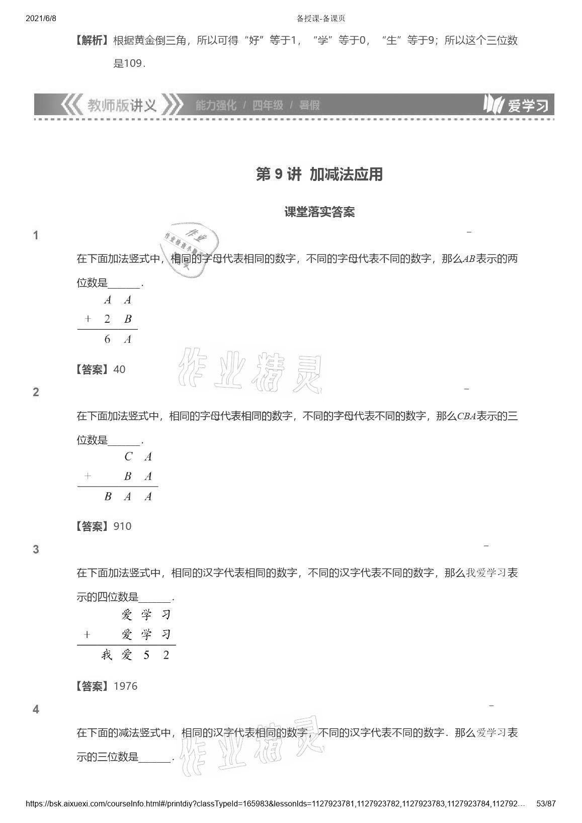 注:目前有些书本章节名称可能整理的还不是很完善,但都是按照顺序排列的,请同学们按照顺序仔细查找。练习册 2021年爱学习数学能力强化体系四年级苏教版首都师范大学出版社 答案主要是用来给同学们做完题方便对答案用的,请勿直接抄袭。