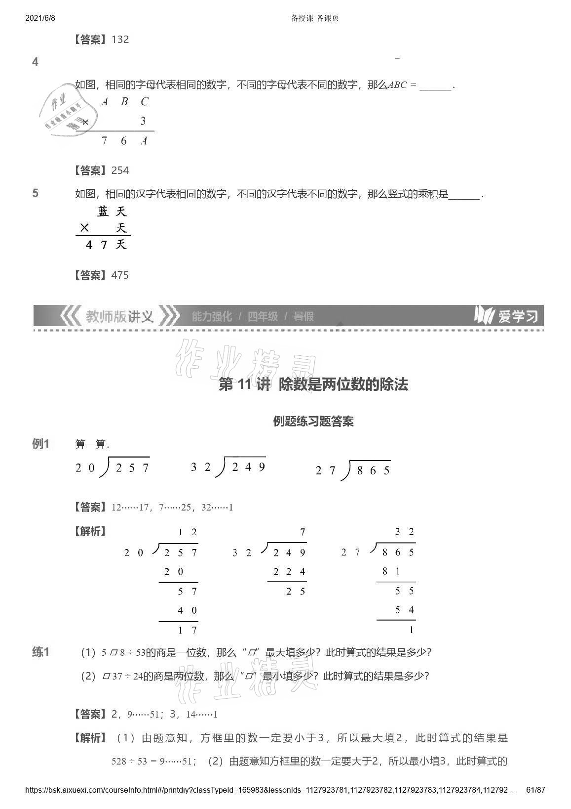 注:目前有些书本章节名称可能整理的还不是很完善,但都是按照顺序排列的,请同学们按照顺序仔细查找。练习册 2021年爱学习数学能力强化体系四年级苏教版首都师范大学出版社 答案主要是用来给同学们做完题方便对答案用的,请勿直接抄袭。