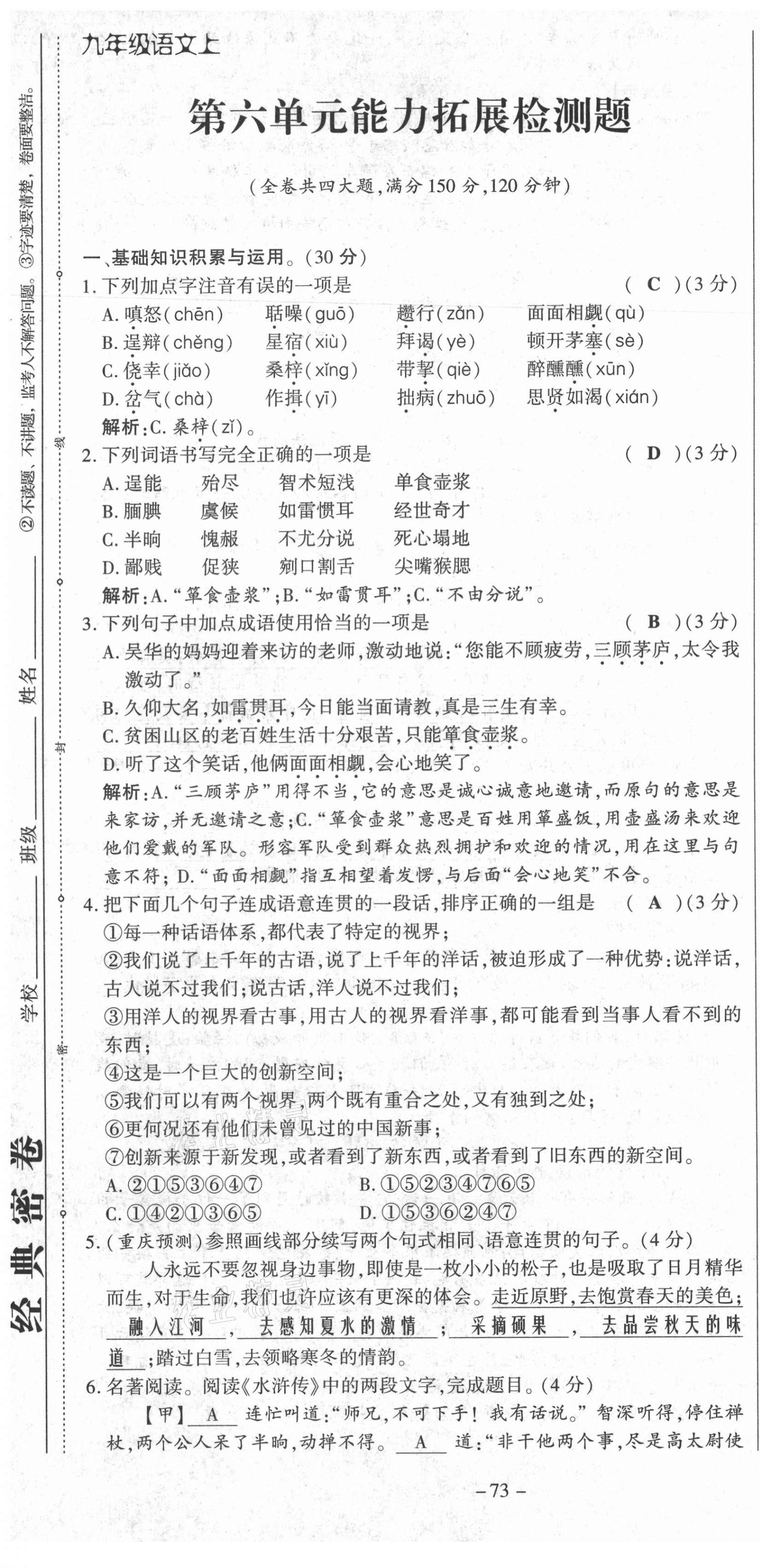 注:目前有些书本章节名称可能整理的还不是很完善,但都是按照顺序排列的,请同学们按照顺序仔细查找。练习册 2021年经典密卷九年级语文上册人教版 答案主要是用来给同学们做完题方便对答案用的,请勿直接抄袭。