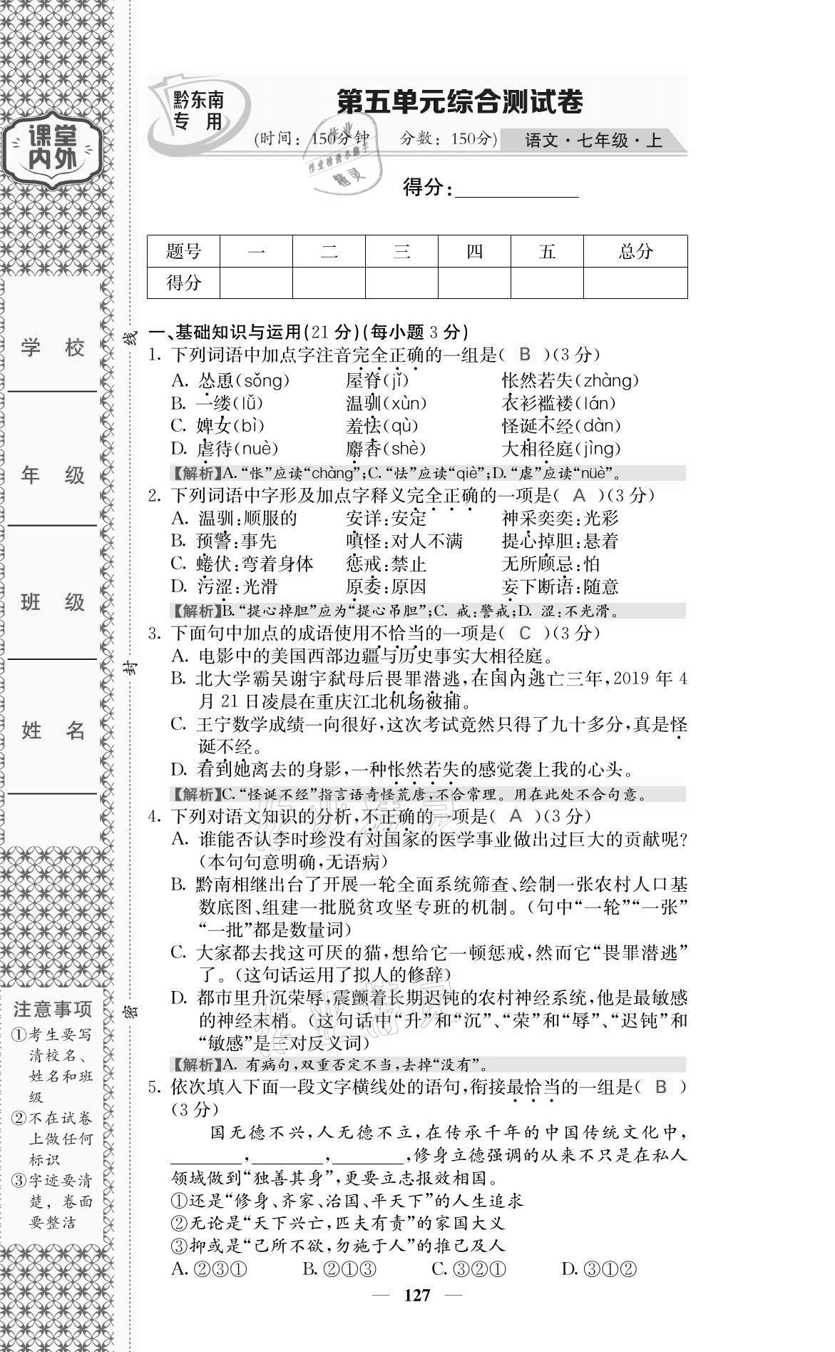 注:目前有些书本章节名称可能整理的还不是很完善,但都是按照顺序排列的,请同学们按照顺序仔细查找。练习册 2021年名校课堂内外七年级语文上册人教版黔东南专版 答案主要是用来给同学们做完题方便对答案用的,请勿直接抄袭。