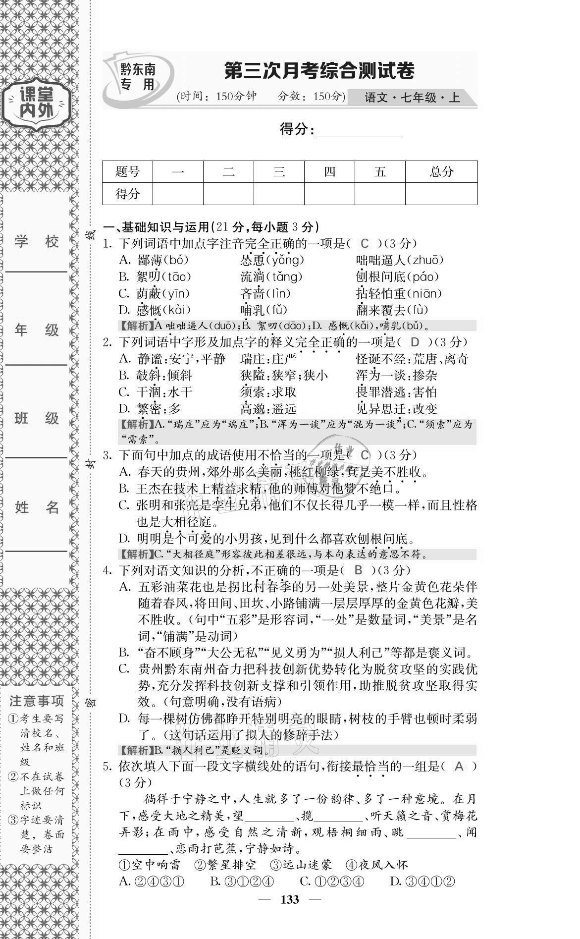 2021年名校课堂内外七年级语文上册人教版黔东南专版