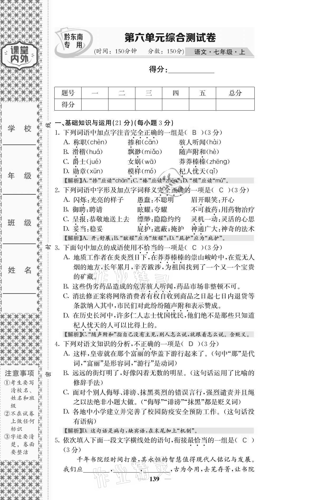 注:目前有些书本章节名称可能整理的还不是很完善,但都是按照顺序排列的,请同学们按照顺序仔细查找。练习册 2021年名校课堂内外七年级语文上册人教版黔东南专版 答案主要是用来给同学们做完题方便对答案用的,请勿直接抄袭。