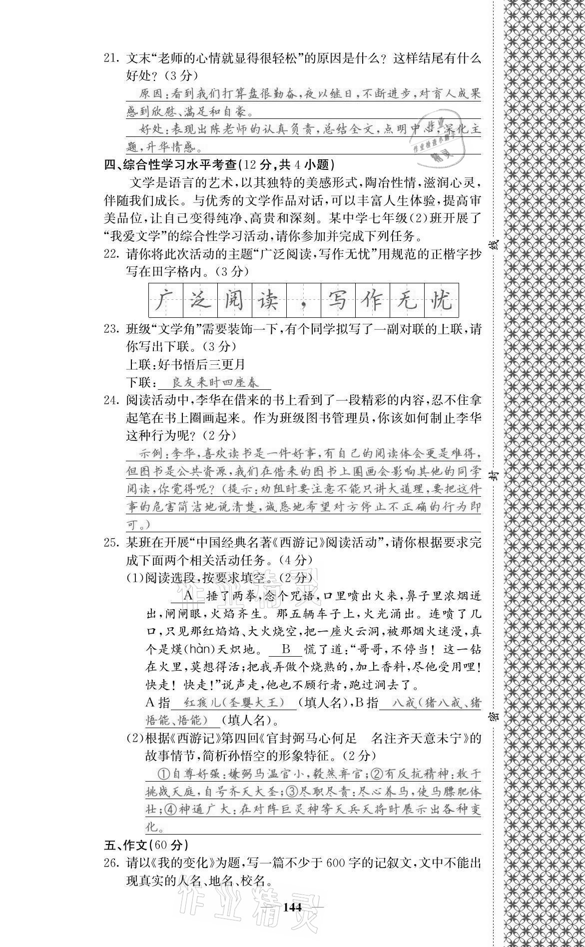 注:目前有些书本章节名称可能整理的还不是很完善,但都是按照顺序排列的,请同学们按照顺序仔细查找。练习册 2021年名校课堂内外七年级语文上册人教版黔东南专版 答案主要是用来给同学们做完题方便对答案用的,请勿直接抄袭。