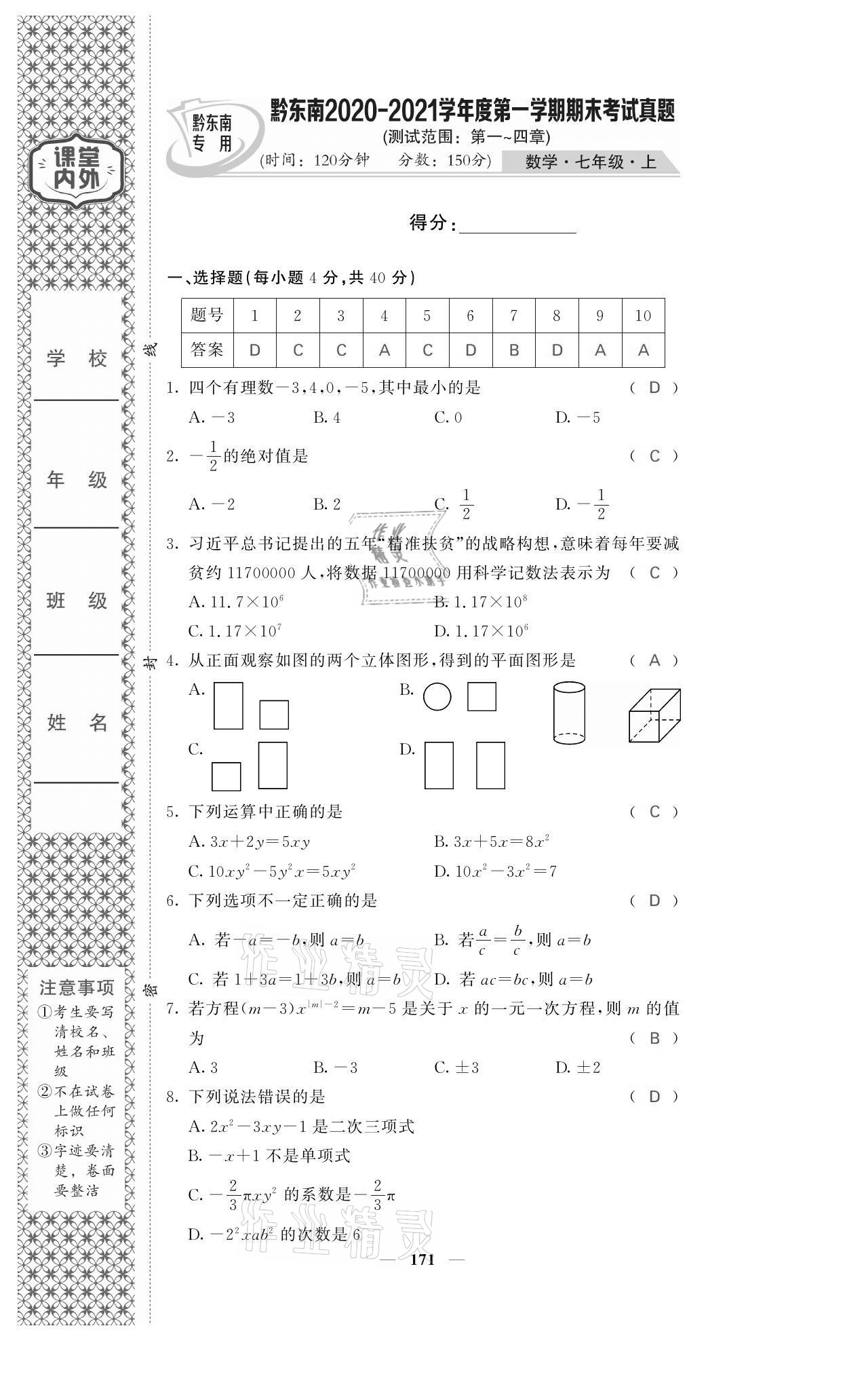 注:目前有些书本章节名称可能整理的还不是很完善,但都是按照顺序排列的,请同学们按照顺序仔细查找。练习册 2021年名校课堂内外七年级数学上册人教版黔东南专版 答案主要是用来给同学们做完题方便对答案用的,请勿直接抄袭。