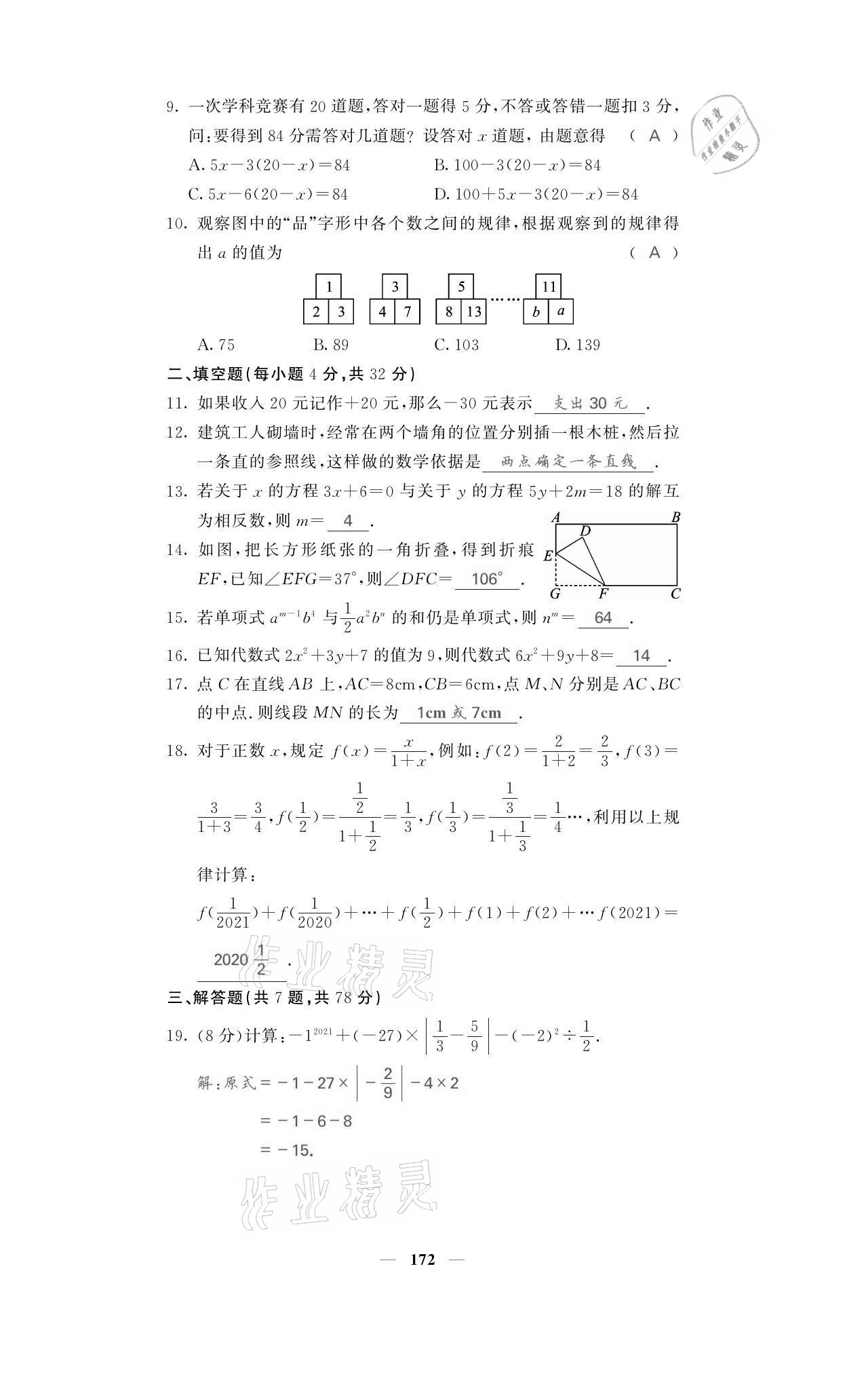 2021年名校课堂内外七年级数学上册人教版黔东南专版
