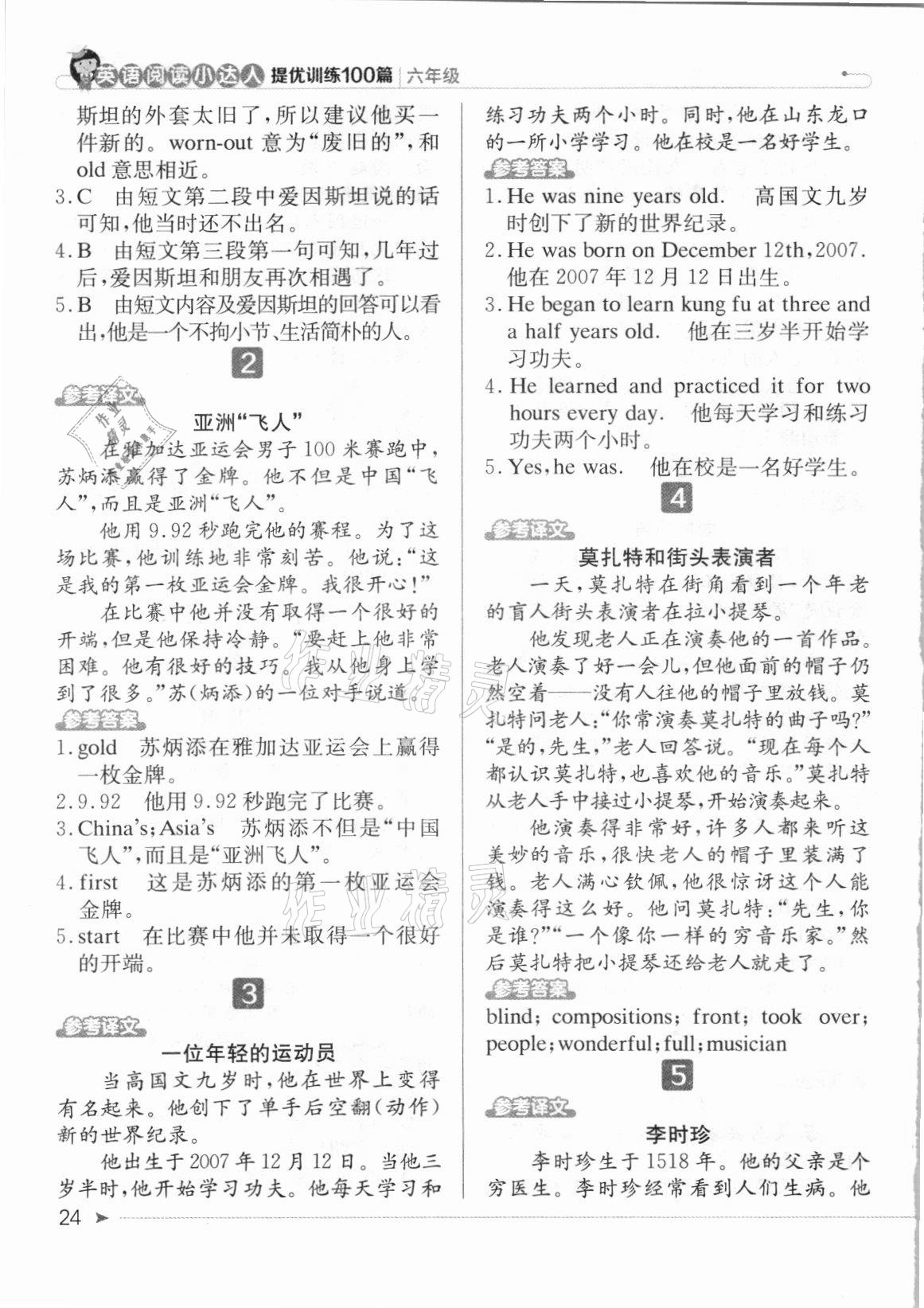 2021年英语阅读小达人提优训练100篇英语六年级人教版