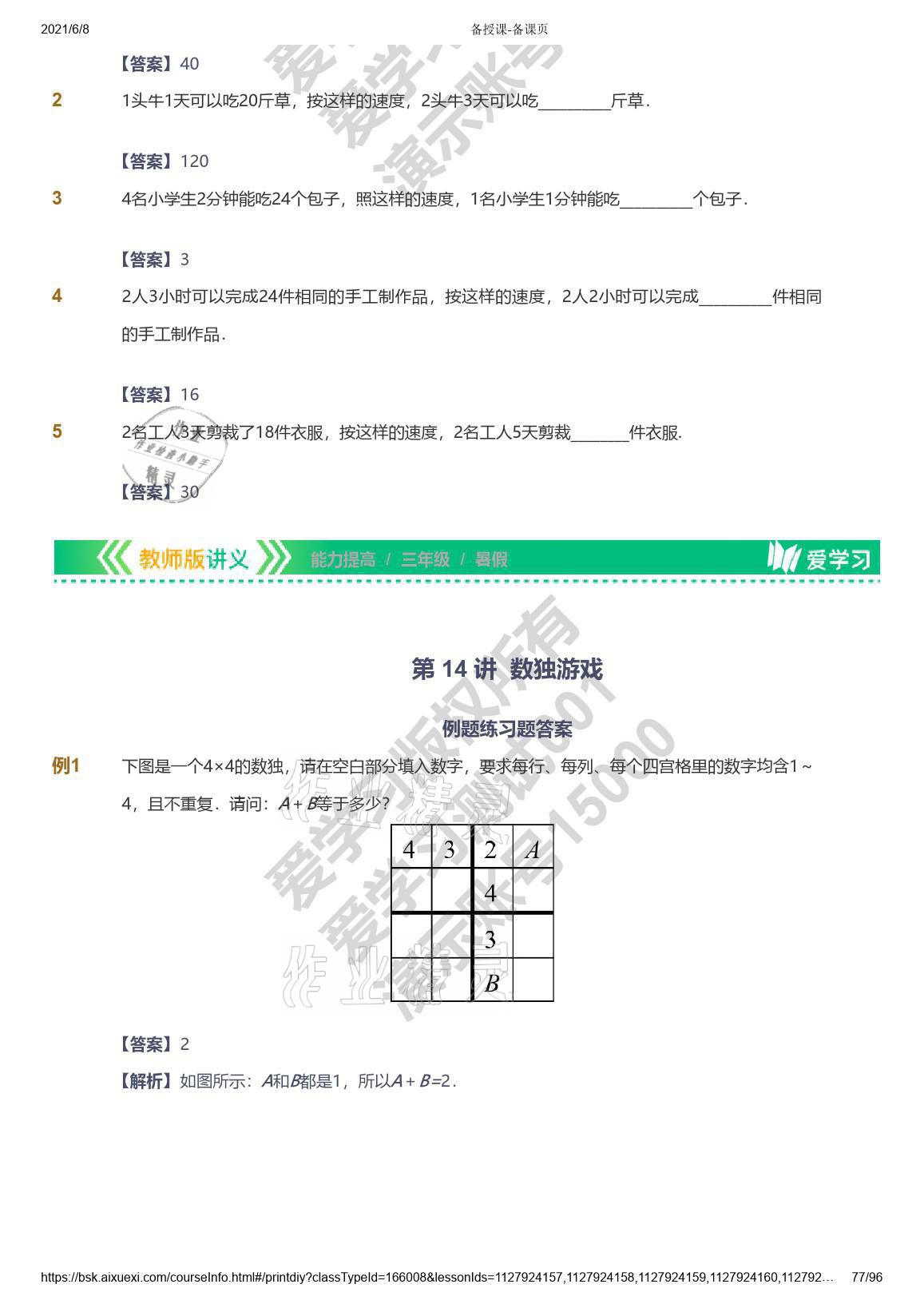 注:目前有些书本章节名称可能整理的还不是很完善,但都是按照顺序排列的,请同学们按照顺序仔细查找。练习册 2021年爱学习数学三年级能力提高体系苏教版 答案主要是用来给同学们做完题方便对答案用的,请勿直接抄袭。