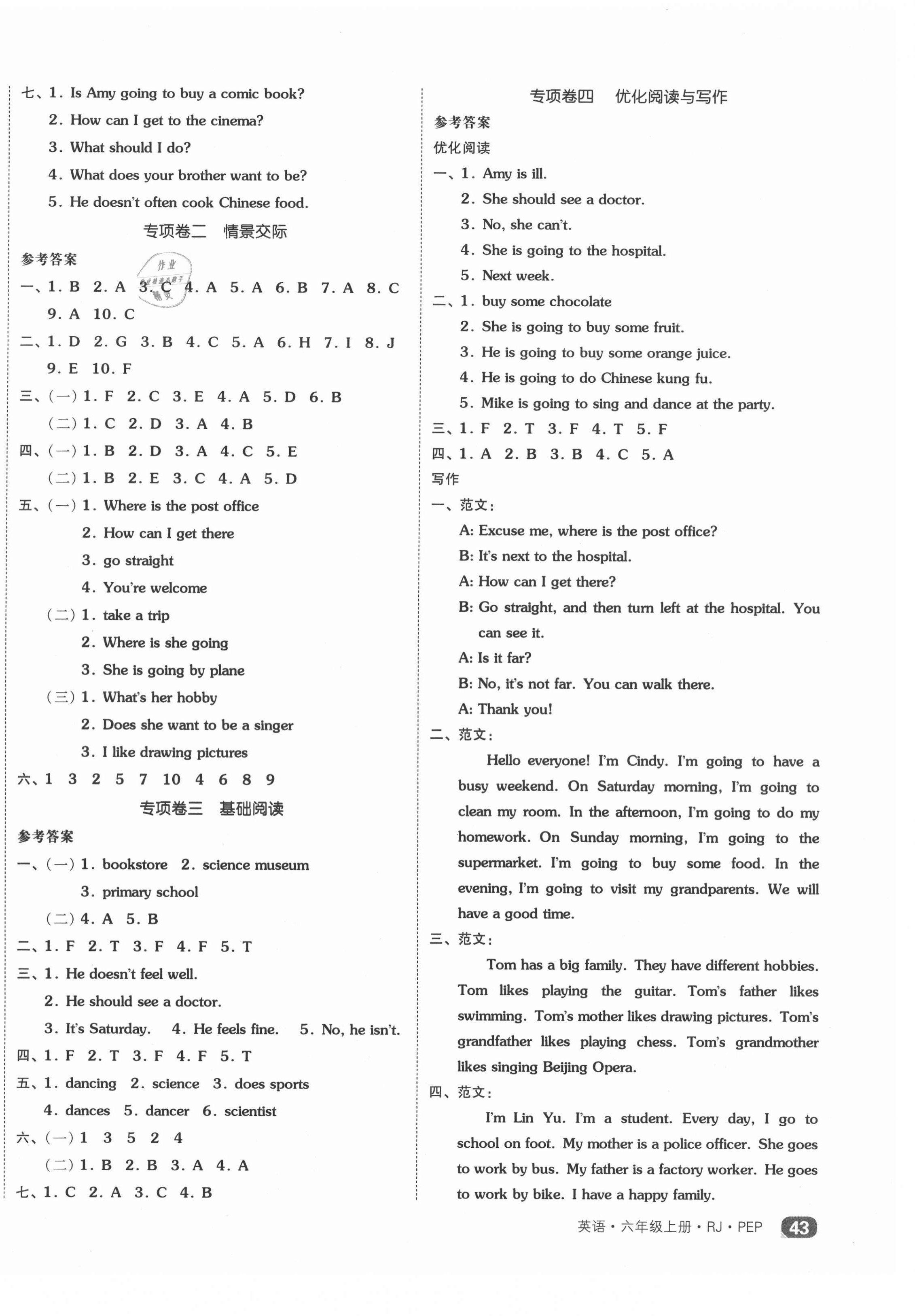 注:目前有些书本章节名称可能整理的还不是很完善,但都是按照顺序排列的,请同学们按照顺序仔细查找。练习册 2021年全品小复习六年级英语上册人教版 答案主要是用来给同学们做完题方便对答案用的,请勿直接抄袭。