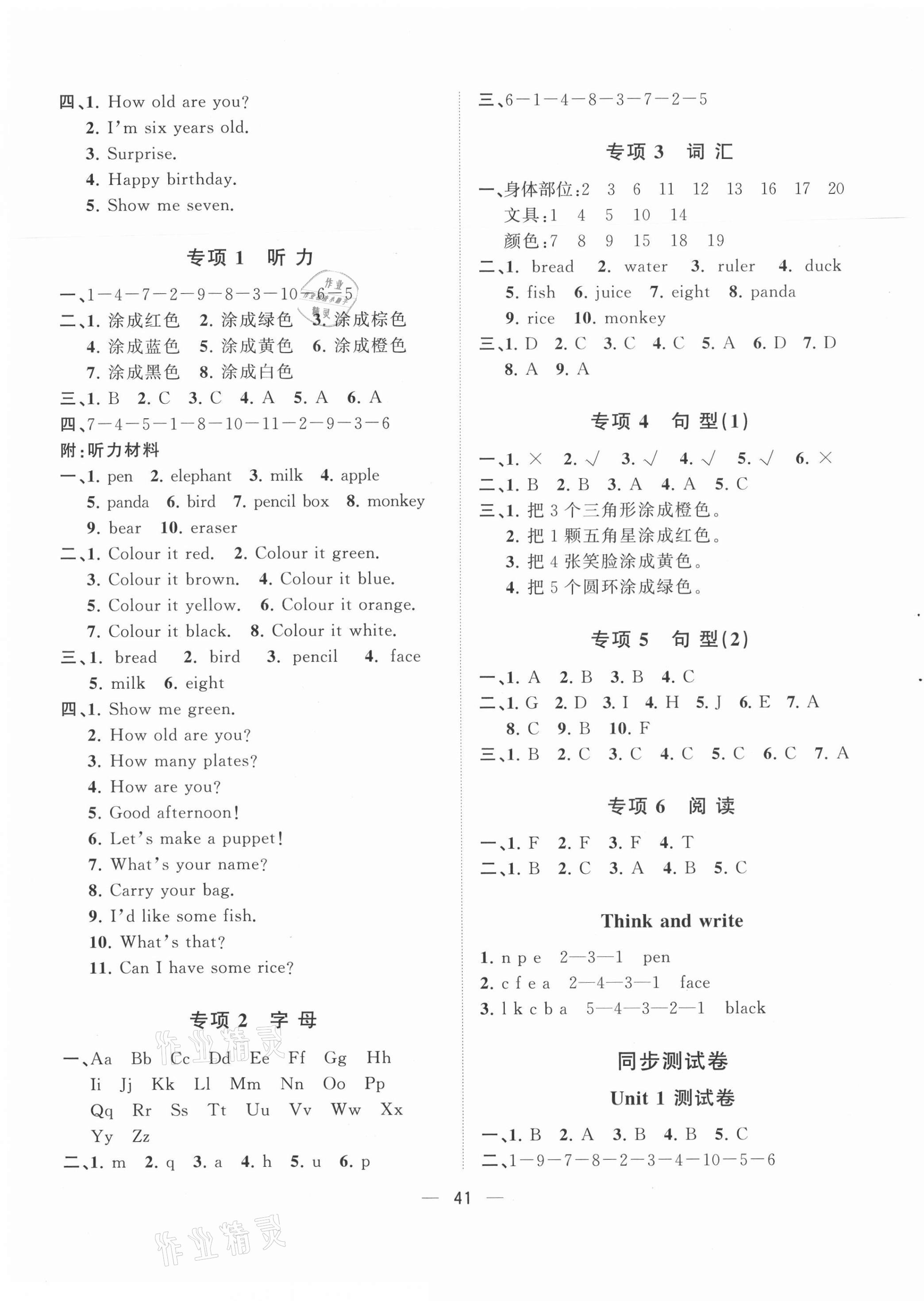 注:目前有些书本章节名称可能整理的还不是很完善,但都是按照顺序排列的,请同学们按照顺序仔细查找。练习册 2021年课堂小作业三年级英语上册人教版 答案主要是用来给同学们做完题方便对答案用的,请勿直接抄袭。