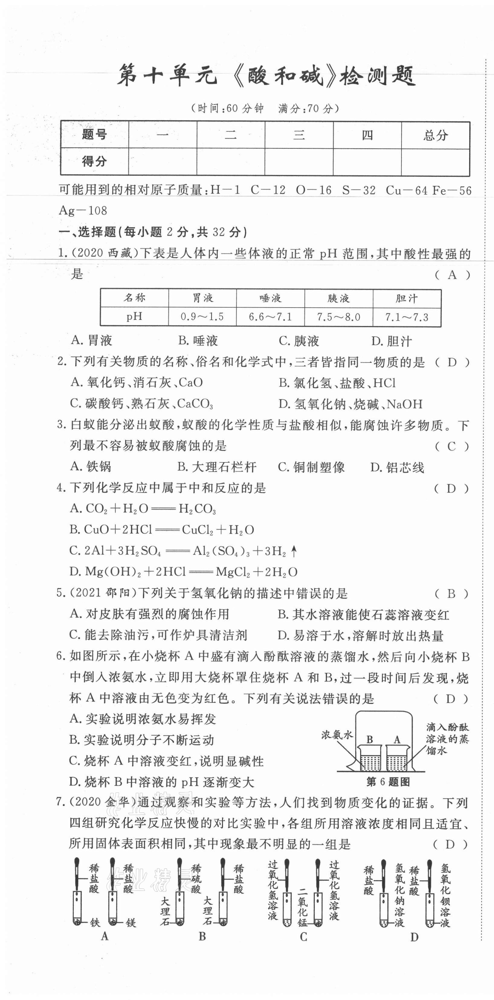 2021年权威考卷九年级化学全一册人教版