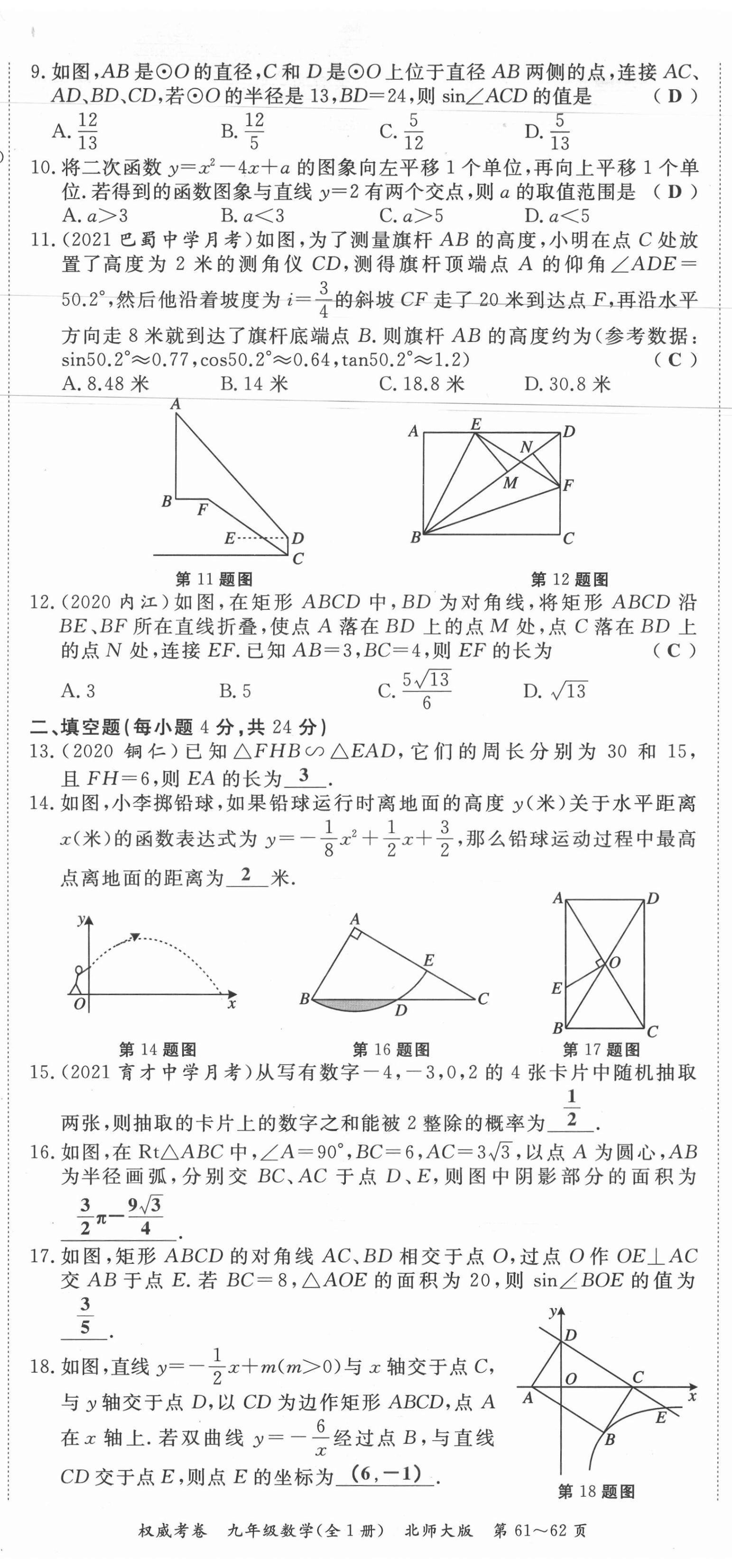 注:目前有些书本章节名称可能整理的还不是很完善,但都是按照顺序排列的,请同学们按照顺序仔细查找。练习册 2021年权威考卷九年级数学全一册北师大版 答案主要是用来给同学们做完题方便对答案用的,请勿直接抄袭。