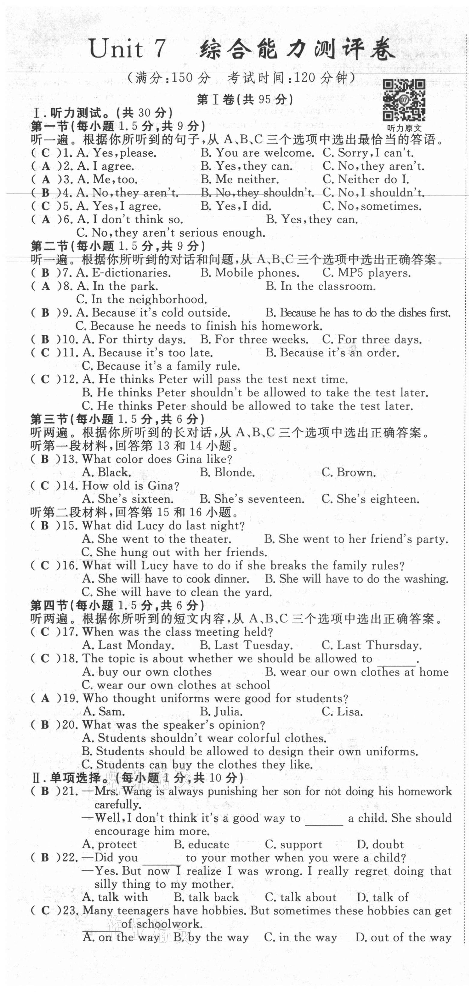 注:目前有些书本章节名称可能整理的还不是很完善,但都是按照顺序排列的,请同学们按照顺序仔细查找。练习册 2021年权威考卷九年级英语全一册人教版 答案主要是用来给同学们做完题方便对答案用的,请勿直接抄袭。