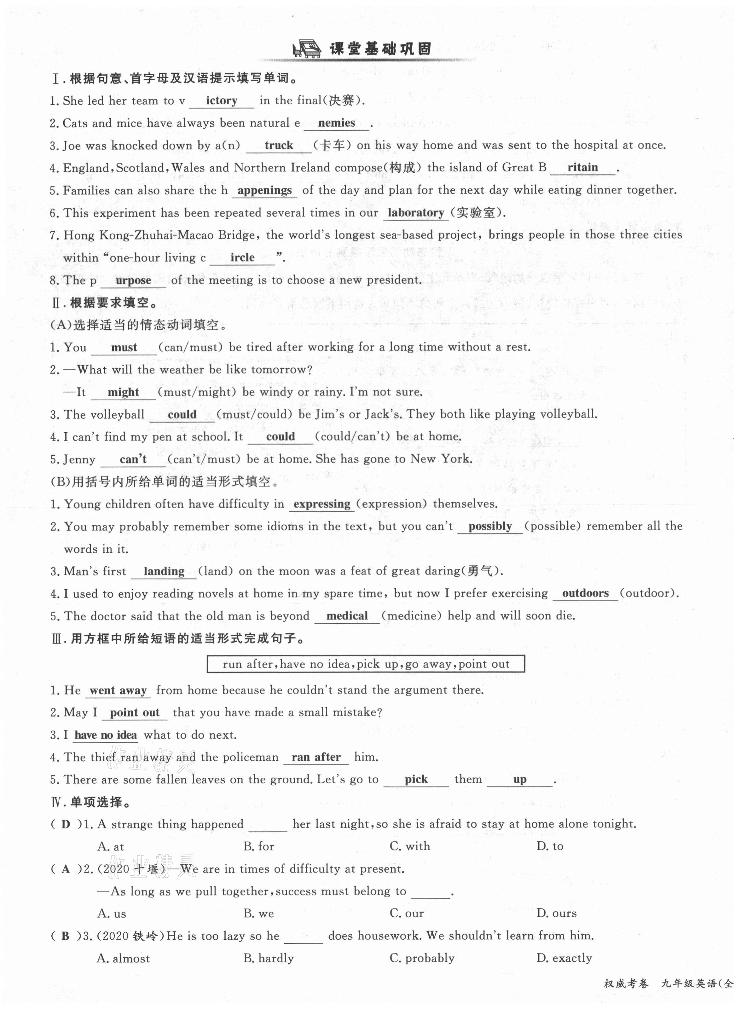 注:目前有些书本章节名称可能整理的还不是很完善,但都是按照顺序排列的,请同学们按照顺序仔细查找。练习册 2021年权威考卷九年级英语全一册人教版 答案主要是用来给同学们做完题方便对答案用的,请勿直接抄袭。