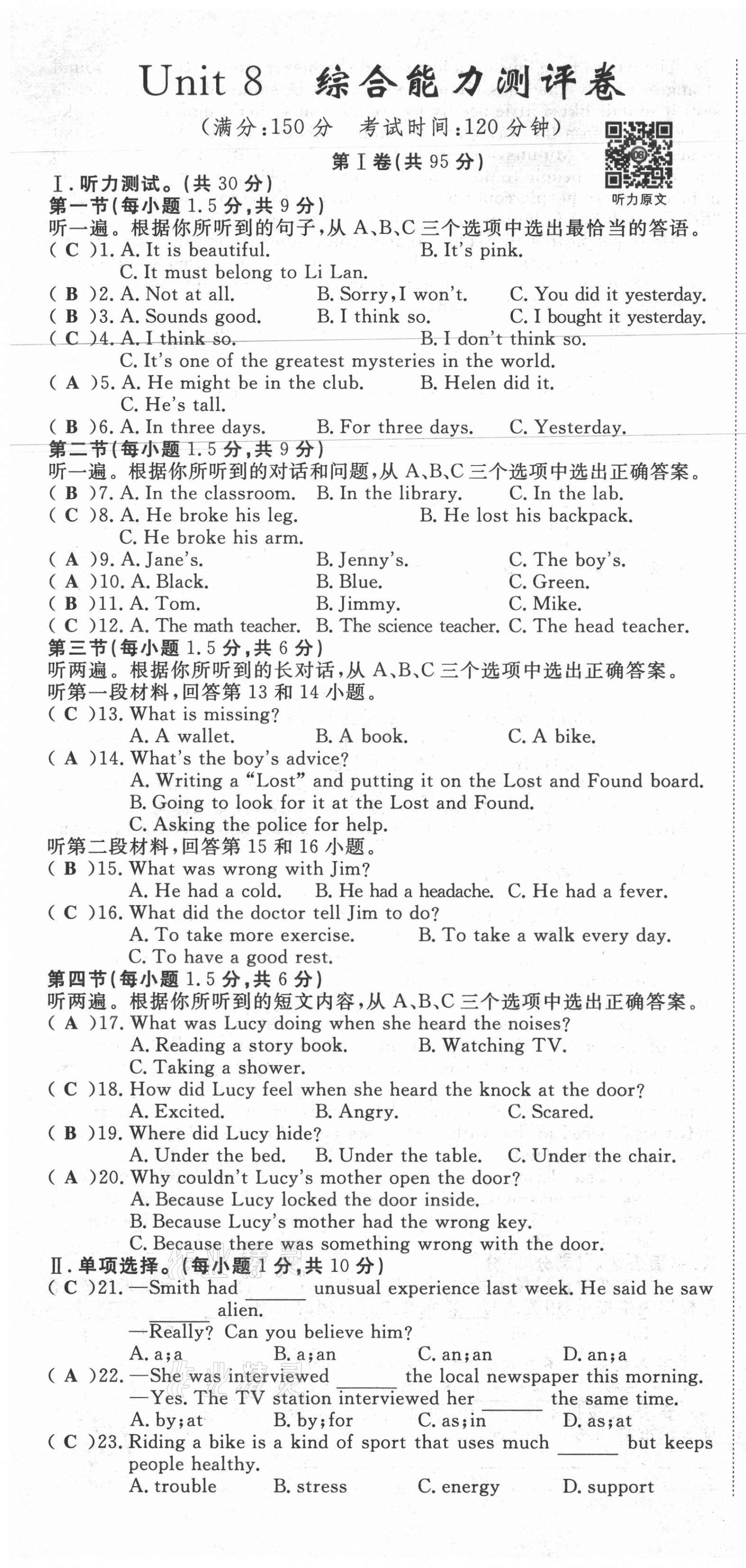 注:目前有些书本章节名称可能整理的还不是很完善,但都是按照顺序排列的,请同学们按照顺序仔细查找。练习册 2021年权威考卷九年级英语全一册人教版 答案主要是用来给同学们做完题方便对答案用的,请勿直接抄袭。
