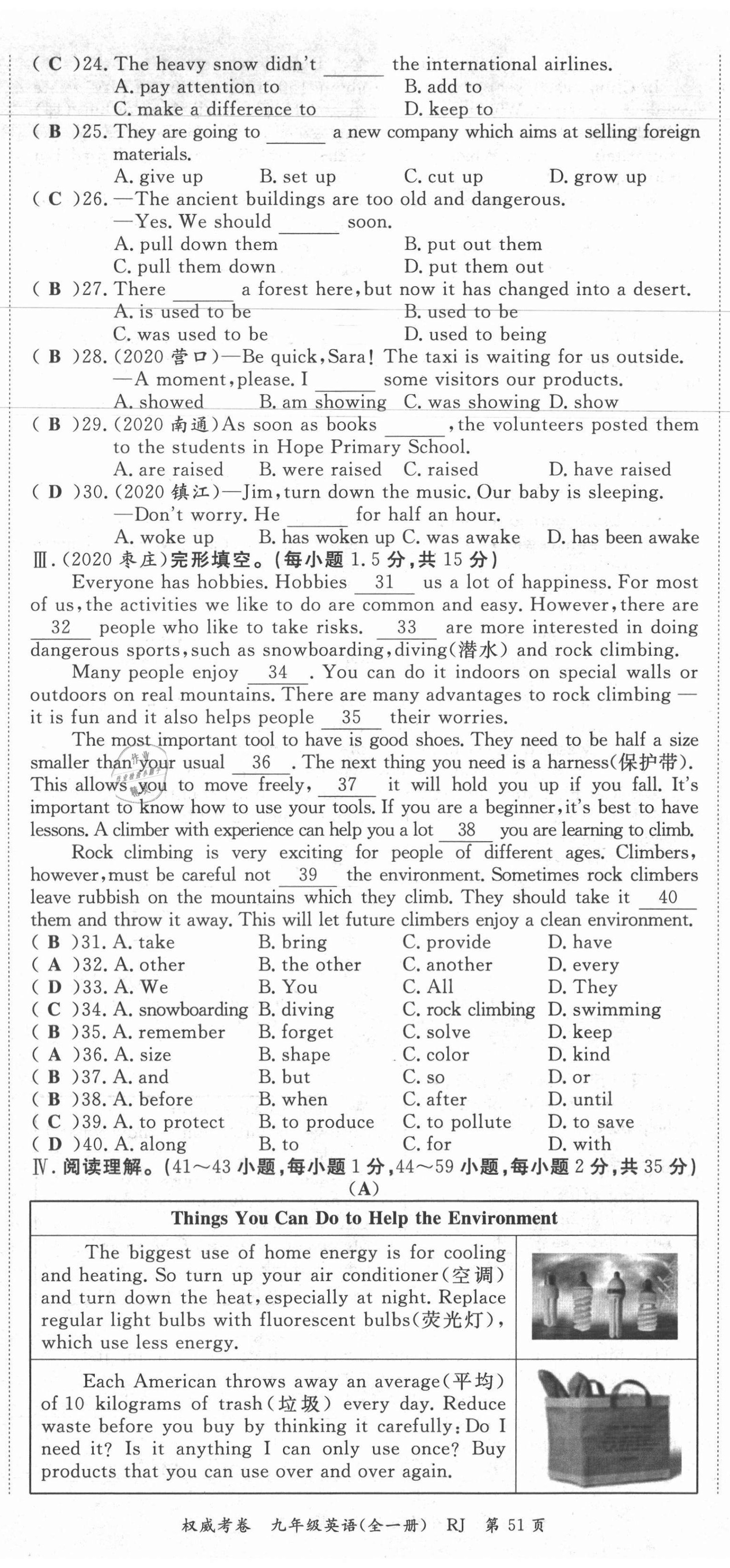 注:目前有些书本章节名称可能整理的还不是很完善,但都是按照顺序排列的,请同学们按照顺序仔细查找。练习册 2021年权威考卷九年级英语全一册人教版 答案主要是用来给同学们做完题方便对答案用的,请勿直接抄袭。