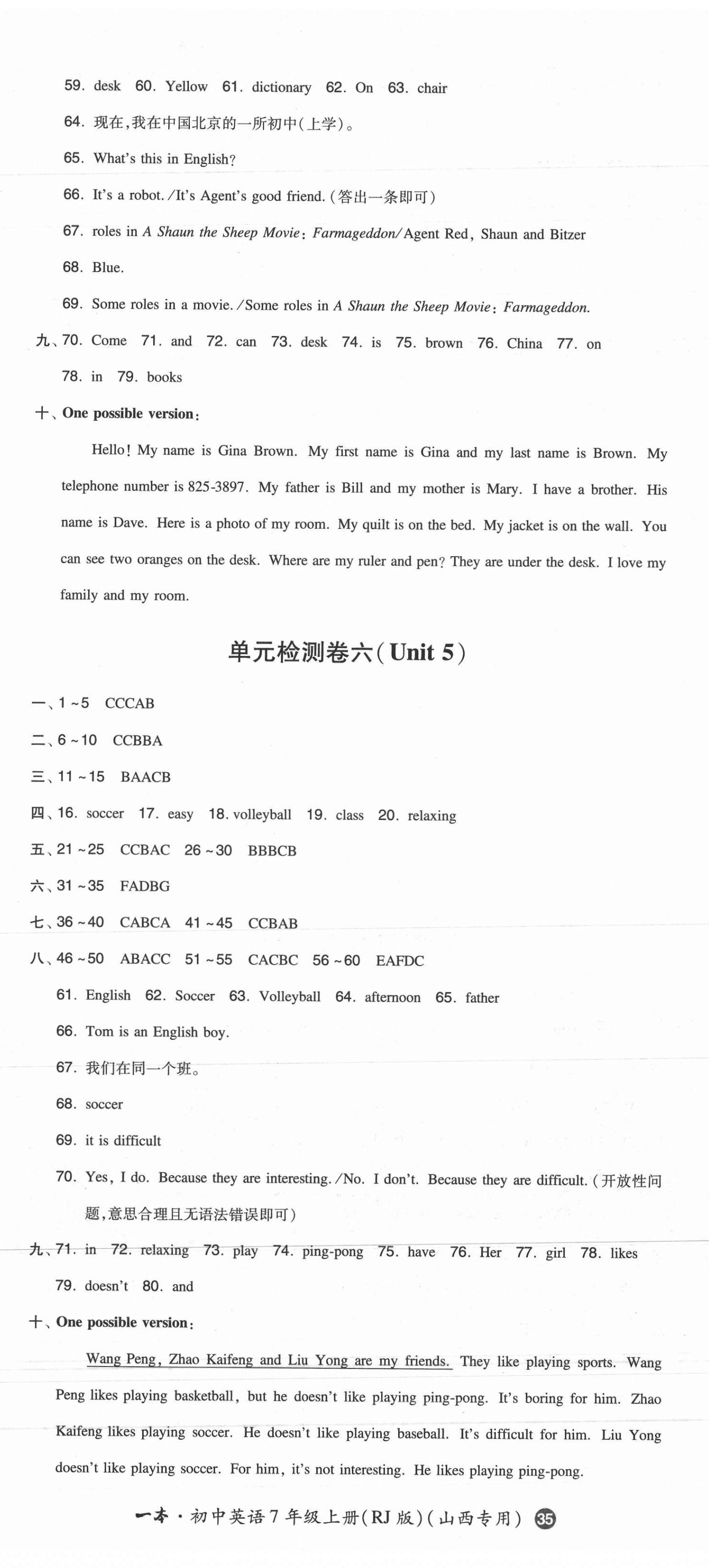 注:目前有些书本章节名称可能整理的还不是很完善,但都是按照顺序排列的,请同学们按照顺序仔细查找。练习册 2021年一本同步训练七年级英语上册人教版山西专版 答案主要是用来给同学们做完题方便对答案用的,请勿直接抄袭。
