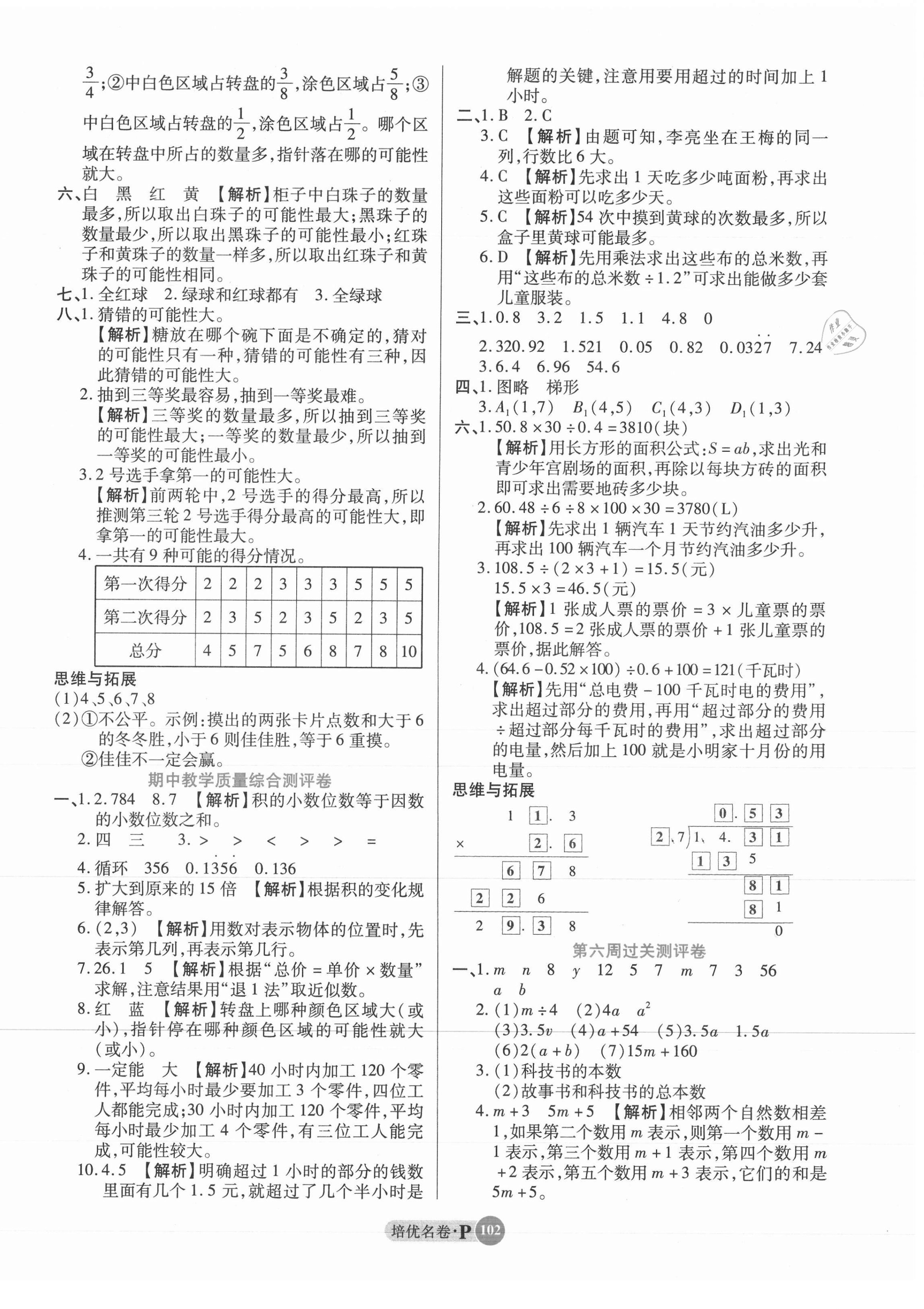 2021年培优名卷五年级数学上册人教版A版