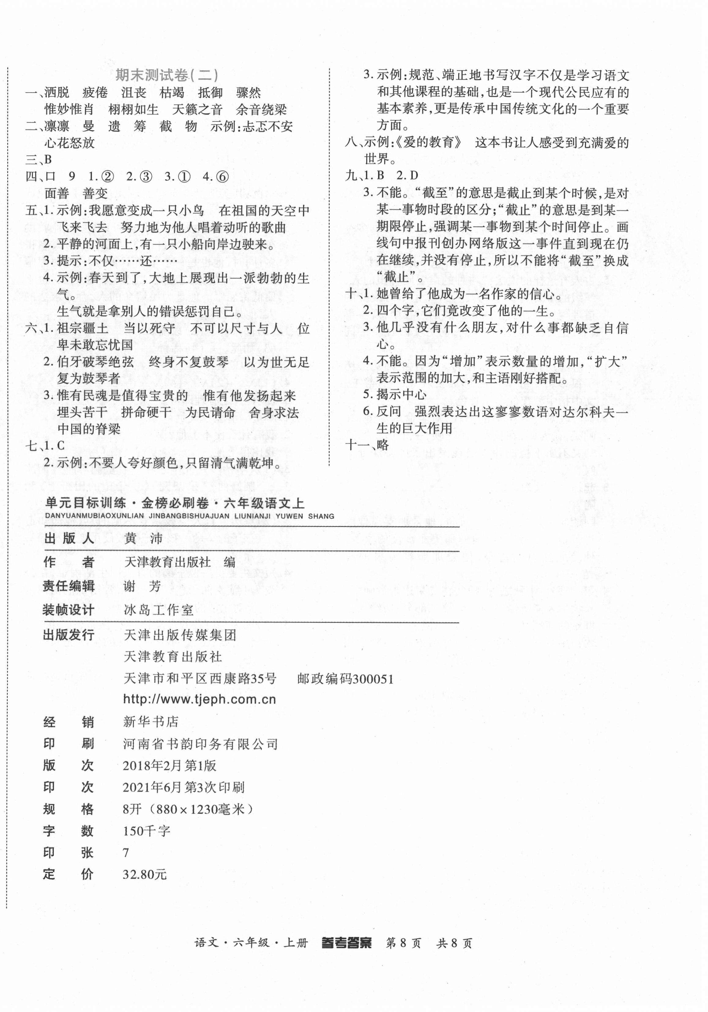注:目前有些书本章节名称可能整理的还不是很完善,但都是按照顺序排列的,请同学们按照顺序仔细查找。练习册 2021年金榜必刷卷六年级语文上册人教版 答案主要是用来给同学们做完题方便对答案用的,请勿直接抄袭。