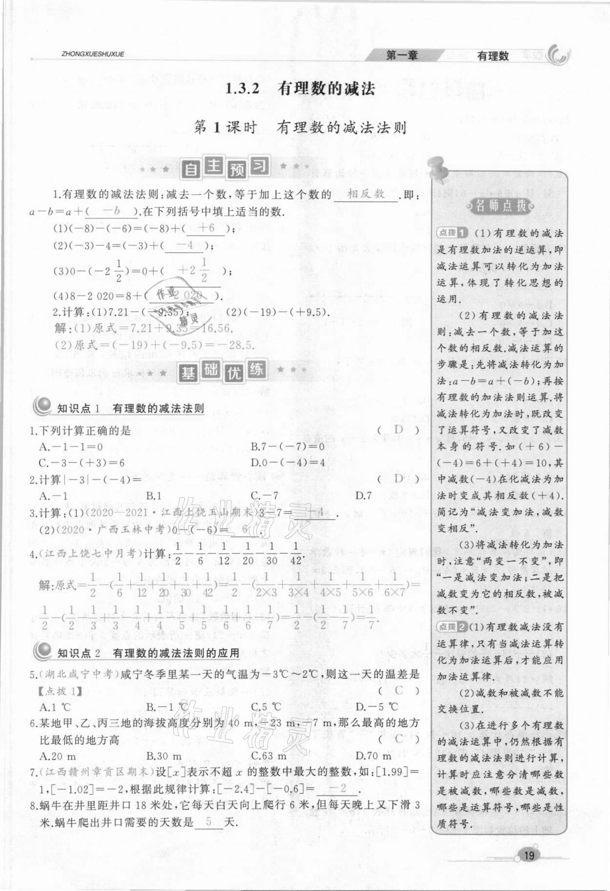 注:目前有些书本章节名称可能整理的还不是很完善,但都是按照顺序排列的,请同学们按照顺序仔细查找。练习册 2021年A加优化作业本七年级数学上册人教版江西专版 答案主要是用来给同学们做完题方便对答案用的,请勿直接抄袭。