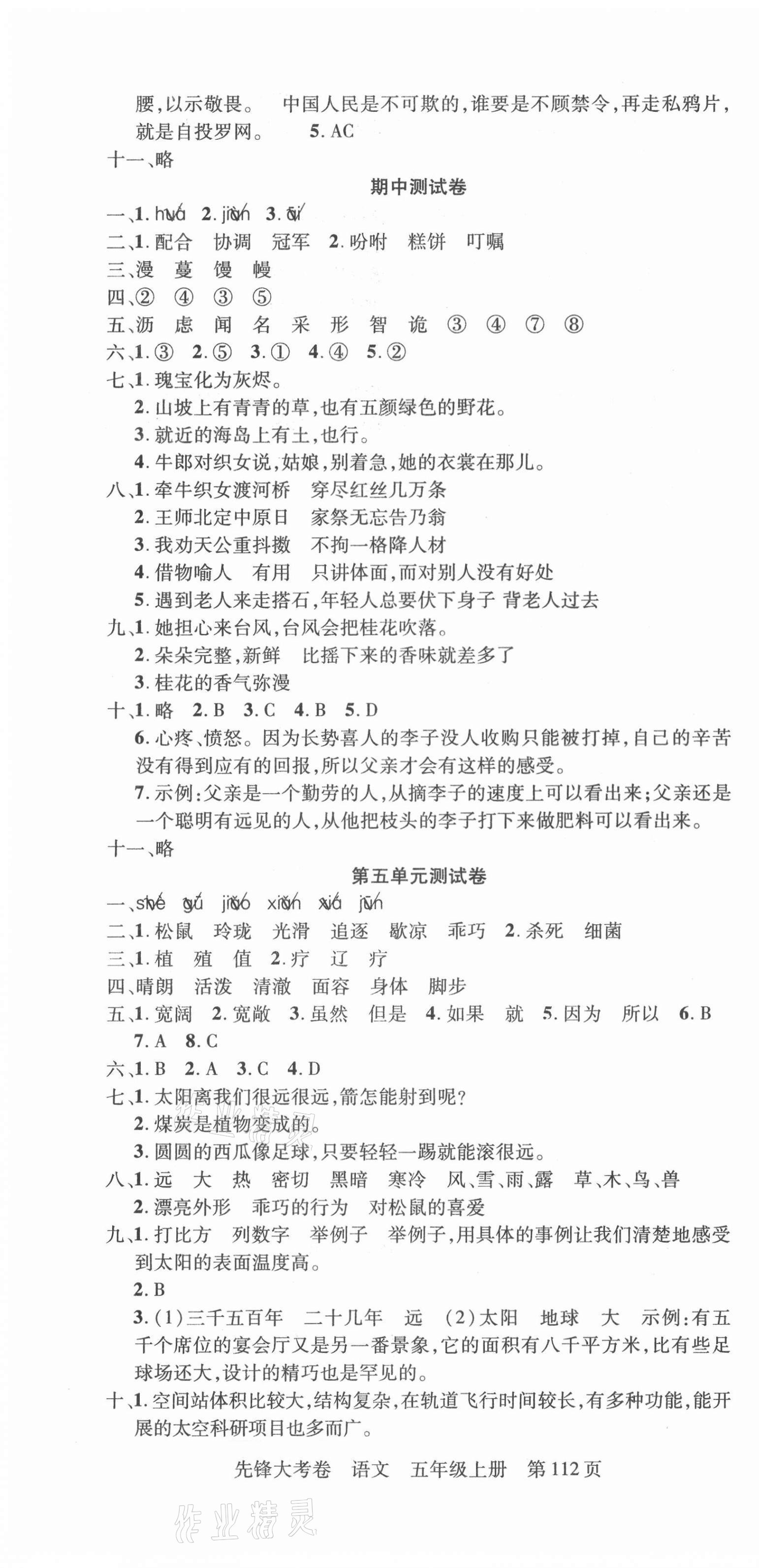 注:目前有些书本章节名称可能整理的还不是很完善,但都是按照顺序排列的,请同学们按照顺序仔细查找。练习册 2021年单元加期末复习先锋大考卷五年级语文上册人教版 答案主要是用来给同学们做完题方便对答案用的,请勿直接抄袭。