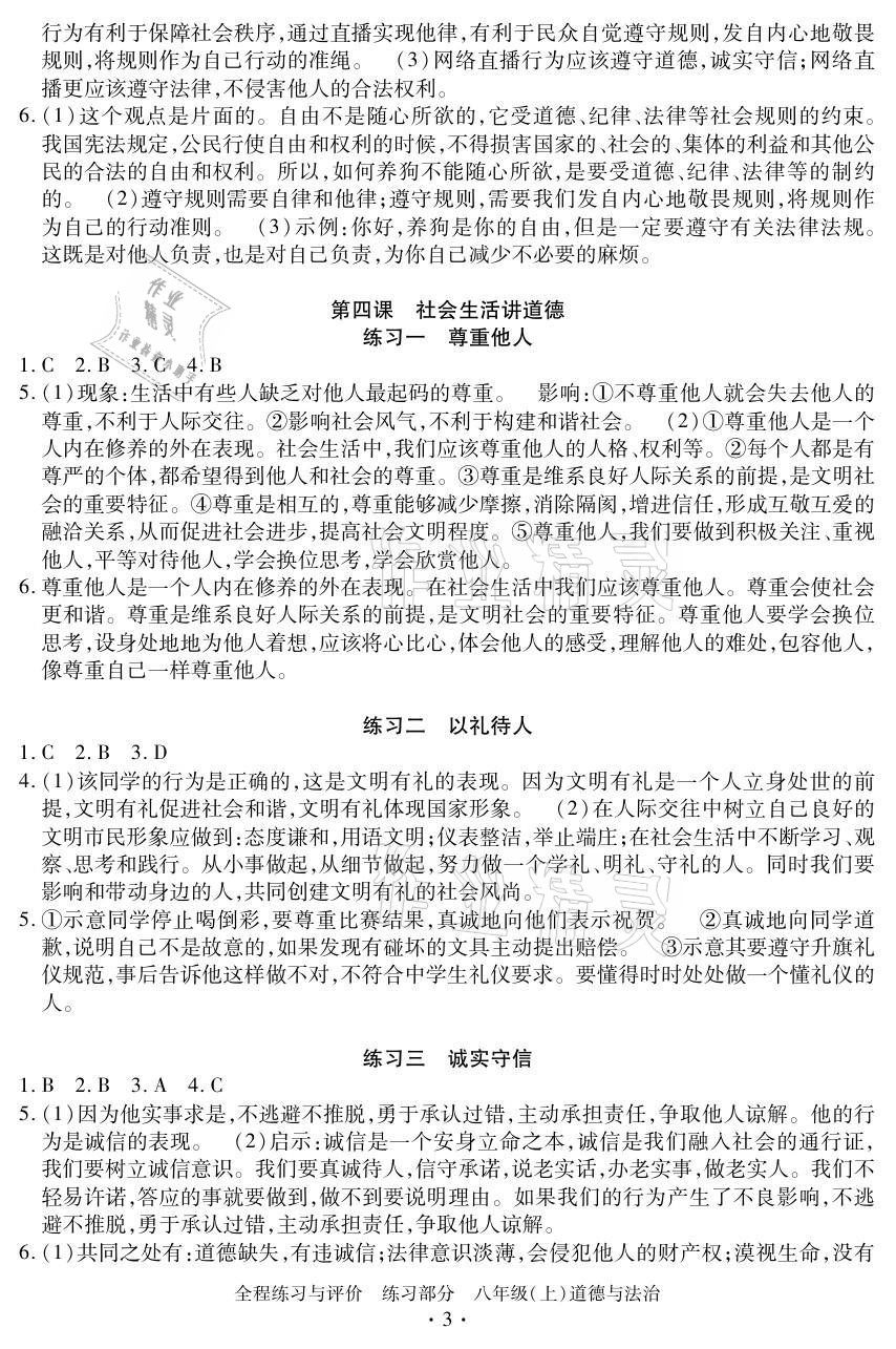 注:目前有些书本章节名称可能整理的还不是很完善,但都是按照顺序排列的,请同学们按照顺序仔细查找。练习册 2021年全程练习与评价八年级道德与法治上册人教版 答案主要是用来给同学们做完题方便对答案用的,请勿直接抄袭。