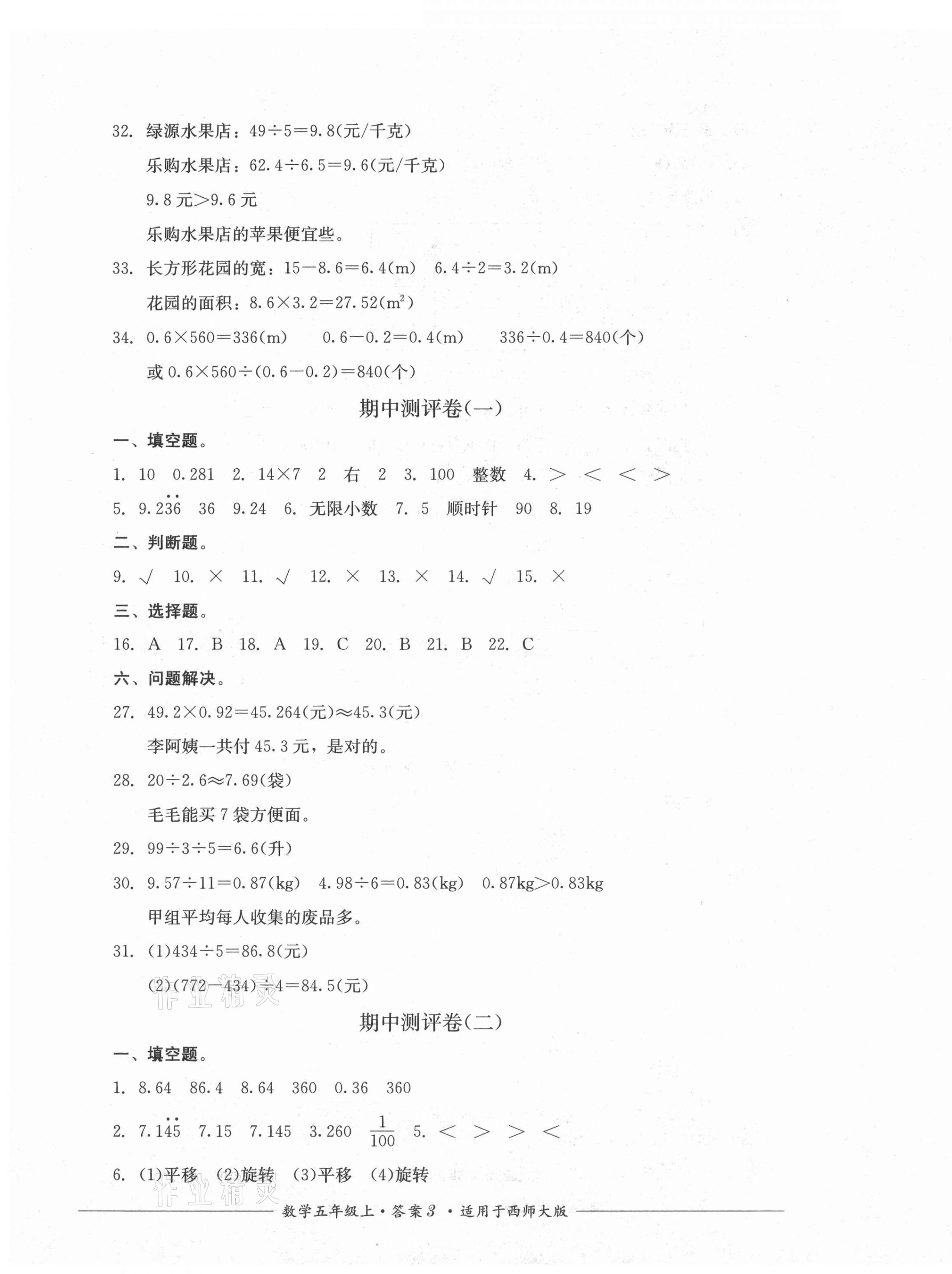 注:目前有些书本章节名称可能整理的还不是很完善,但都是按照顺序排列的,请同学们按照顺序仔细查找。练习册 2021年单元测评四川教育出版社五年级数学上册西师大版 答案主要是用来给同学们做完题方便对答案用的,请勿直接抄袭。