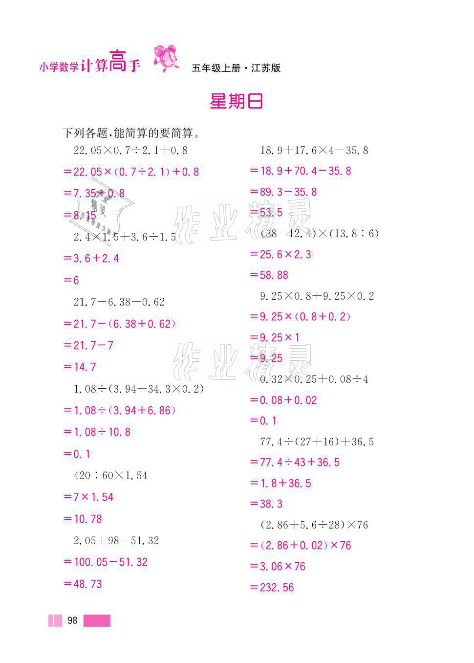 2021年超能学典小学数学计算高手五年级上册江苏版