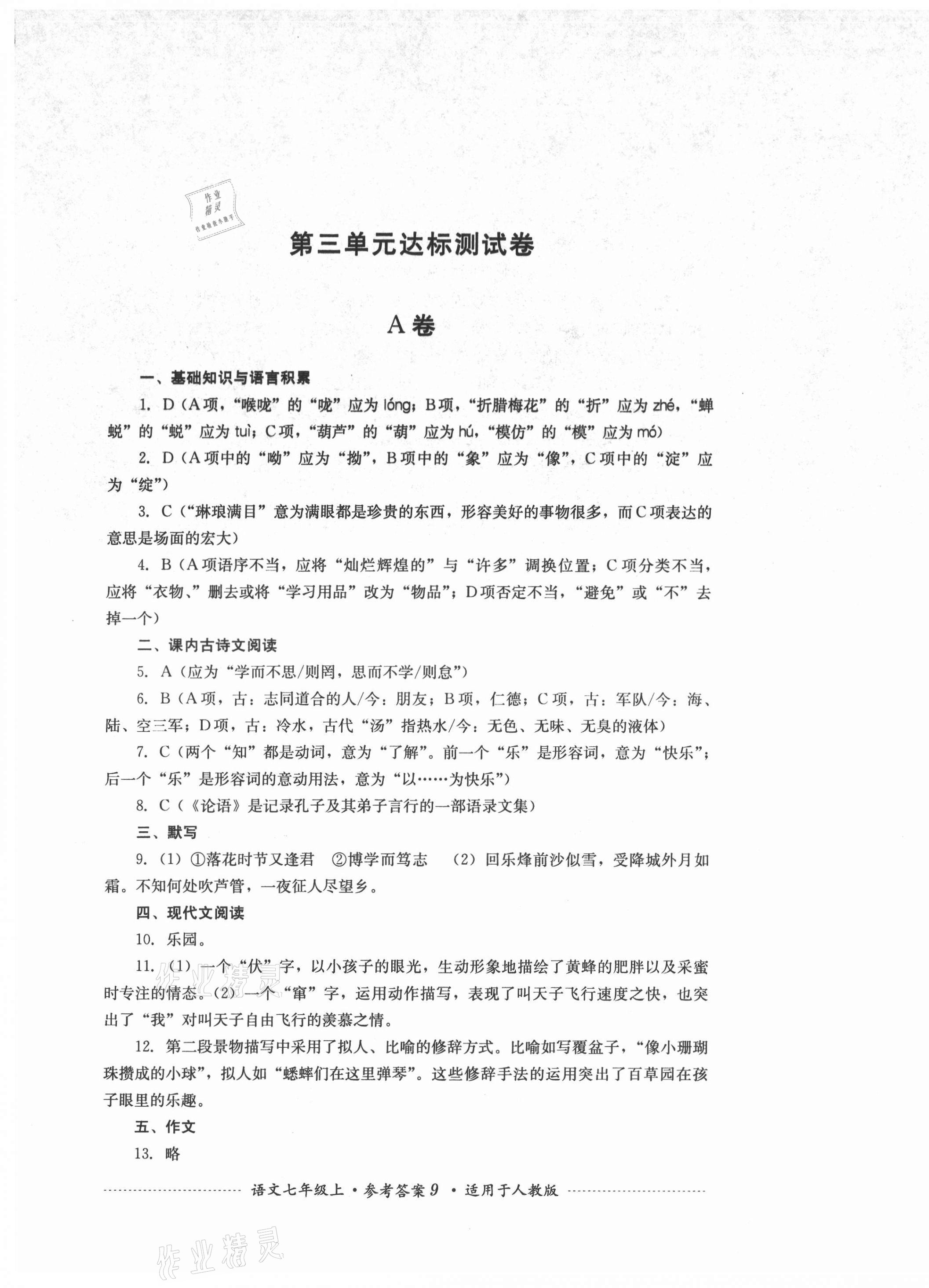 注:目前有些书本章节名称可能整理的还不是很完善,但都是按照顺序排列的,请同学们按照顺序仔细查找。练习册 2021年单元测试七年级语文上册人教版四川教育出版社 答案主要是用来给同学们做完题方便对答案用的,请勿直接抄袭。