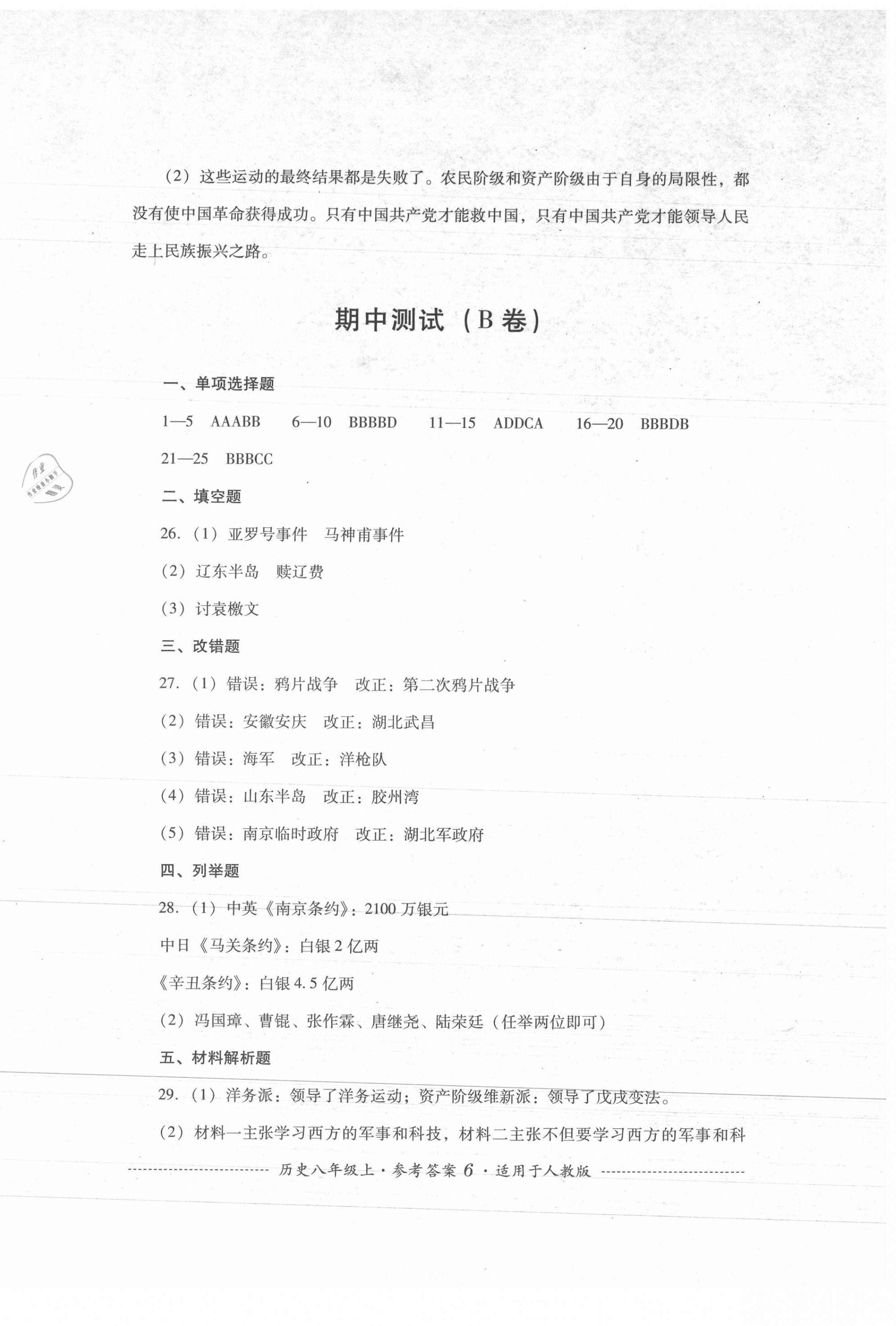 注:目前有些书本章节名称可能整理的还不是很完善,但都是按照顺序排列的,请同学们按照顺序仔细查找。练习册 2021年单元测试四川教育出版社八年级历史上册人教版 答案主要是用来给同学们做完题方便对答案用的,请勿直接抄袭。