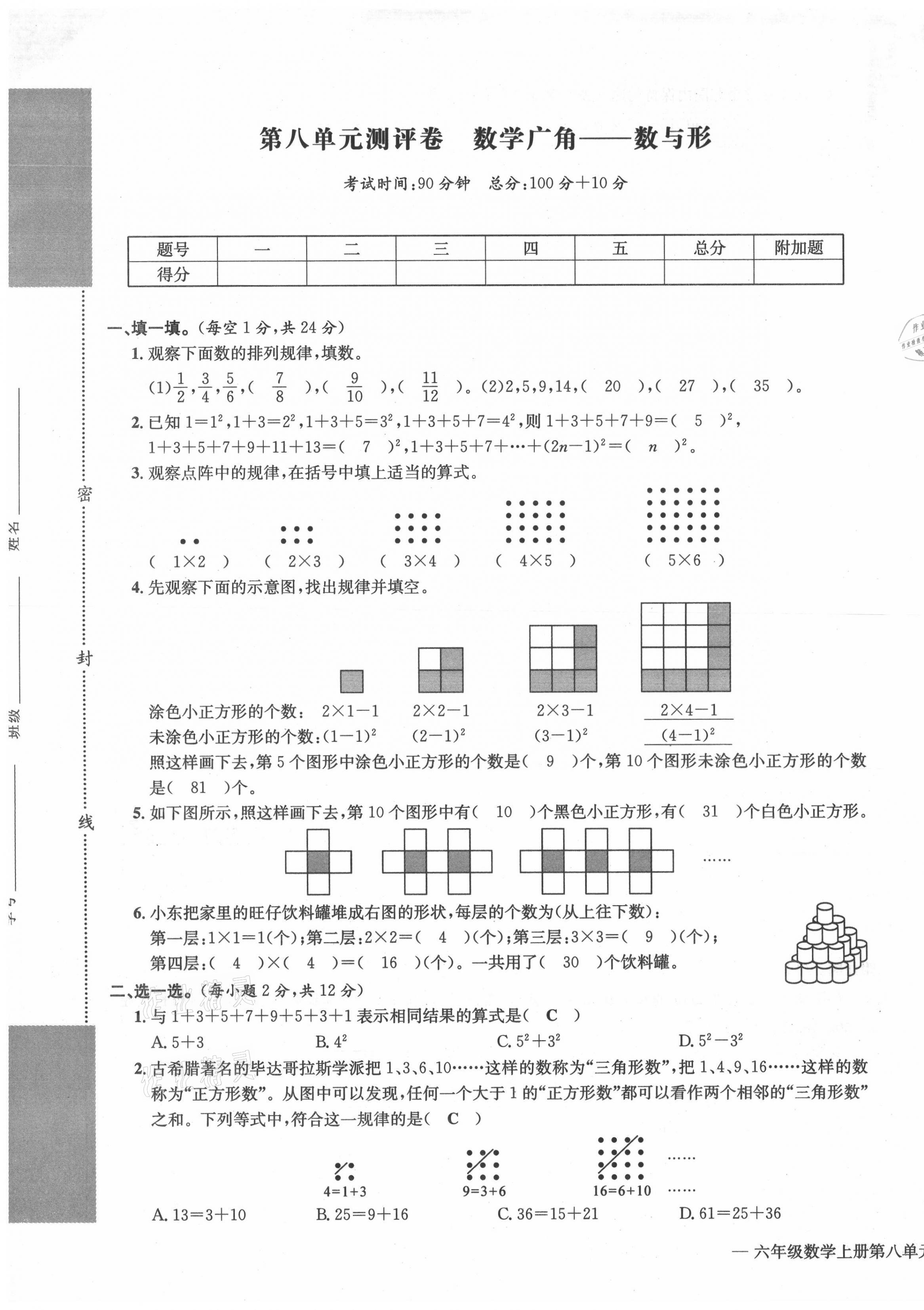 2021年学业评价测评卷六年级数学上册人教版