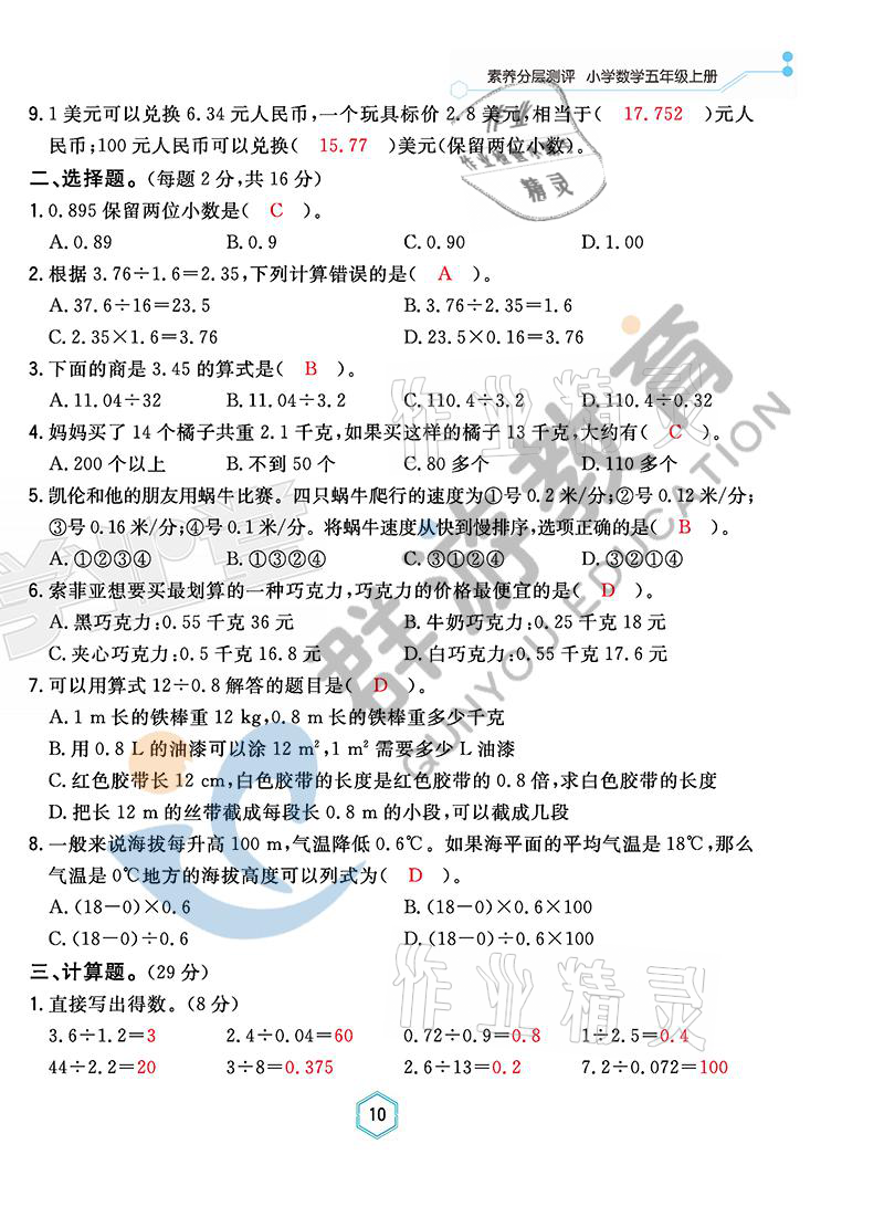 注:目前有些书本章节名称可能整理的还不是很完善,但都是按照顺序排列的,请同学们按照顺序仔细查找。练习册 2021年双全学业堂五年级数学上册人教版 答案主要是用来给同学们做完题方便对答案用的,请勿直接抄袭。