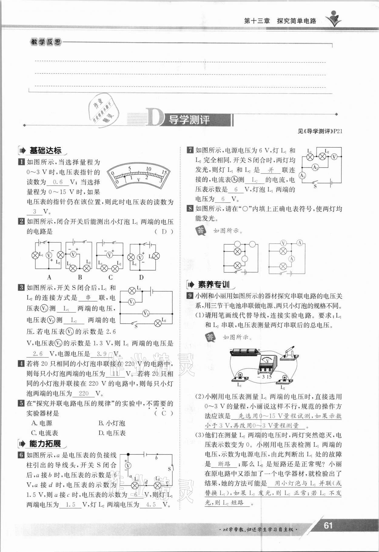 注:目前有些书本章节名称可能整理的还不是很完善,但都是按照顺序排列的,请同学们按照顺序仔细查找。练习册 2021年金太阳导学测评九年级物理全一册沪粤版 答案主要是用来给同学们做完题方便对答案用的,请勿直接抄袭。