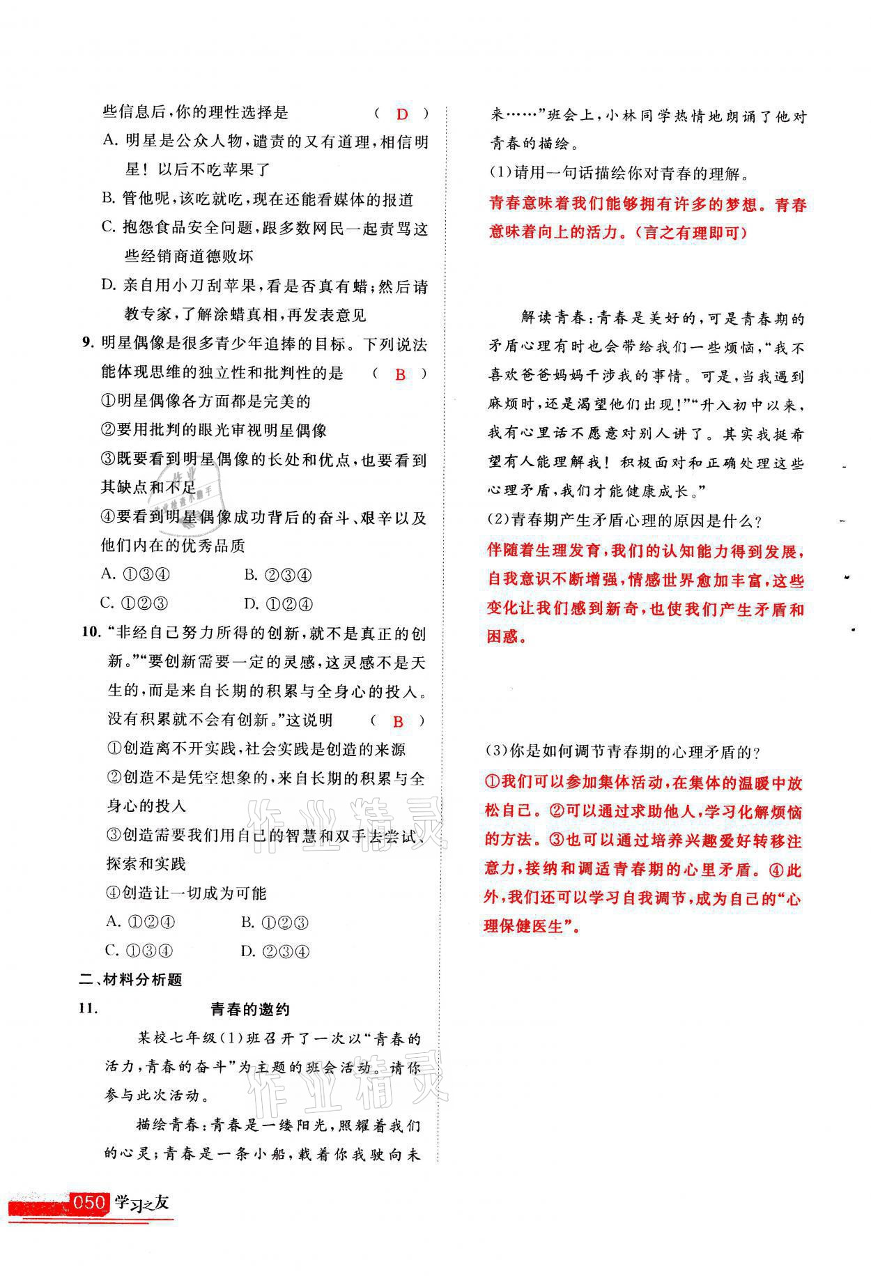 注:目前有些书本章节名称可能整理的还不是很完善,但都是按照顺序排列的,请同学们按照顺序仔细查找。练习册 2021年学习之友七年级道德与法治全一册人教版 答案主要是用来给同学们做完题方便对答案用的,请勿直接抄袭。