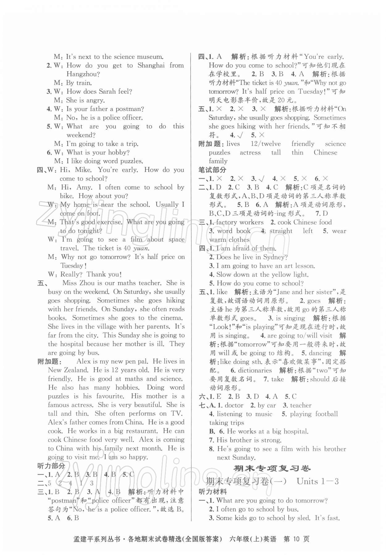 注:目前有些书本章节名称可能整理的还不是很完善,但都是按照顺序排列的,请同学们按照顺序仔细查找。练习册 2021年孟建平各地期末试卷精选六年级英语上册人教版台州专版 答案主要是用来给同学们做完题方便对答案用的,请勿直接抄袭。